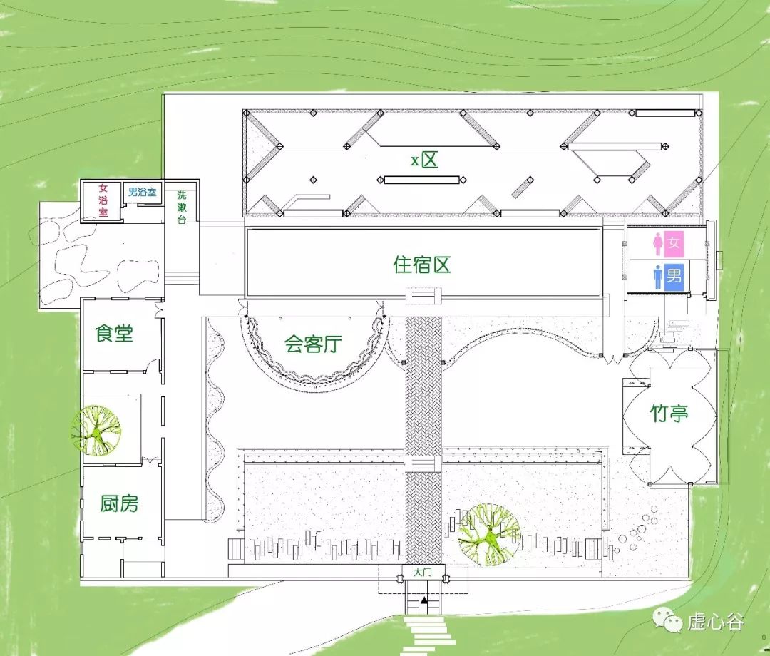 虚心谷原为一所闲置的村小学。在华中科技大学建规学院副院长谭刚毅教授亲自主持下,小学进行了全面设计整修。