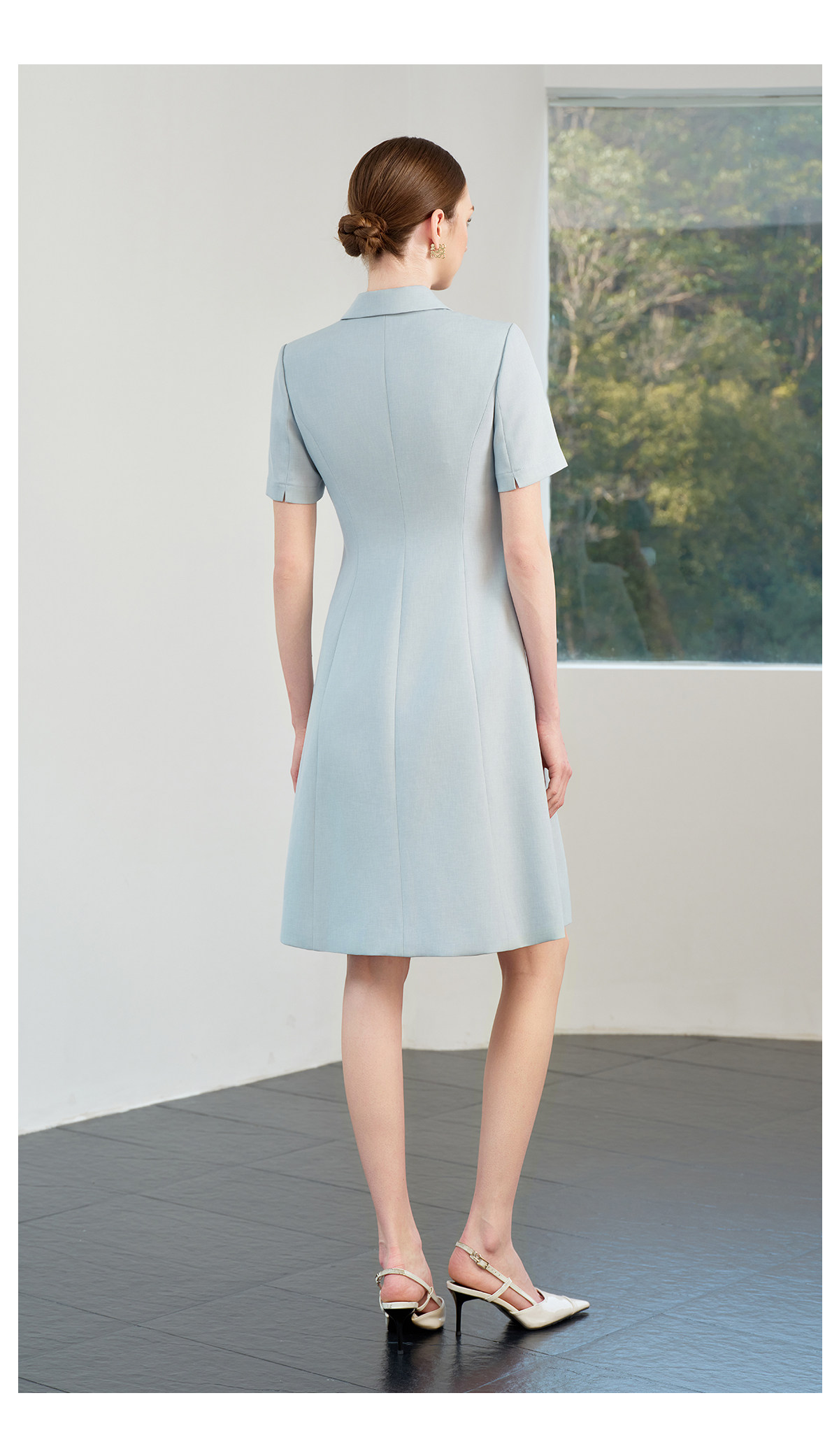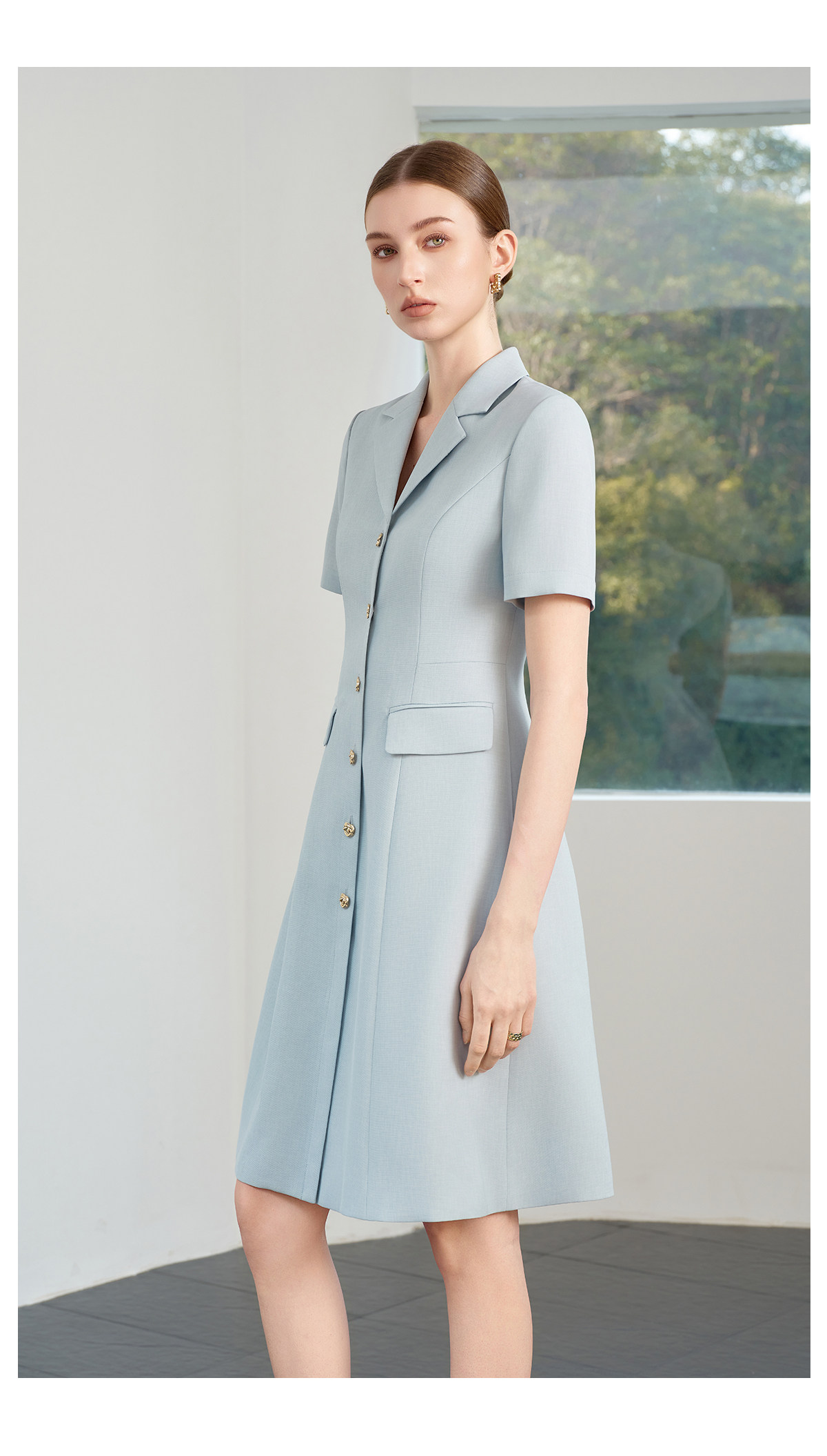 雾蓝色西装领连衣裙,是通勤穿搭的温柔答案。利落翻领修饰肩颈线条,收腰剪裁勾勒曼妙身形,把干练与优雅焊在身上,上班穿得体又大方。