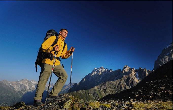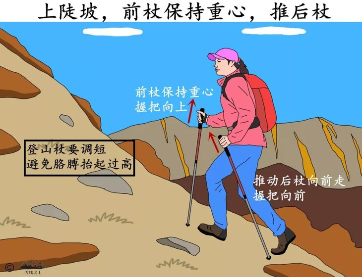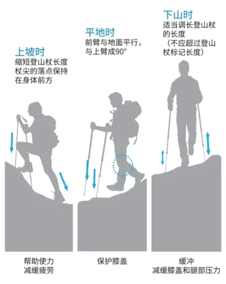 登山杖:学会灵活调整长度,平地时肘关节90度,上坡缩短3-5厘米,下坡加长5-8厘米。