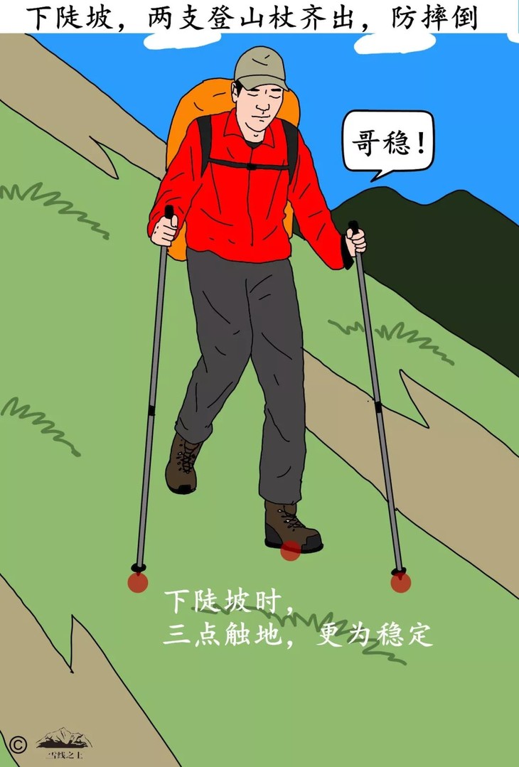 下坡时步幅要比上坡时更小,碎步下行更安全、更省关节。