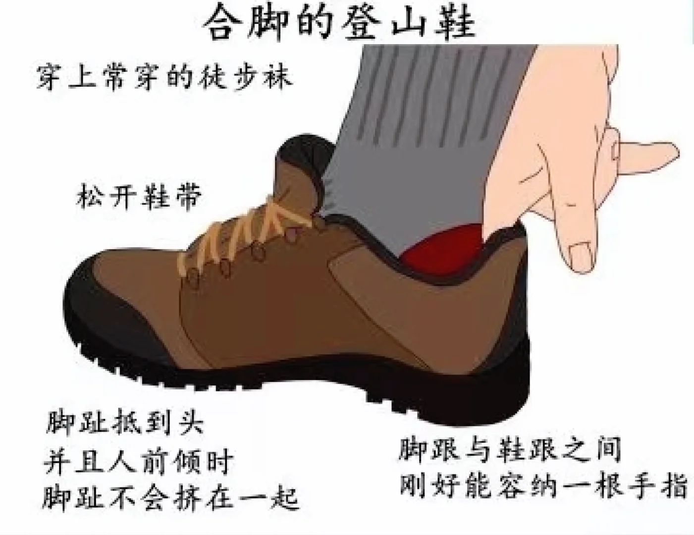 鞋子:选大半码很重要,避免下坡时脚趾顶到鞋头;崎岖山路选择中高帮的鞋子能给脚踝提供更好的支撑。