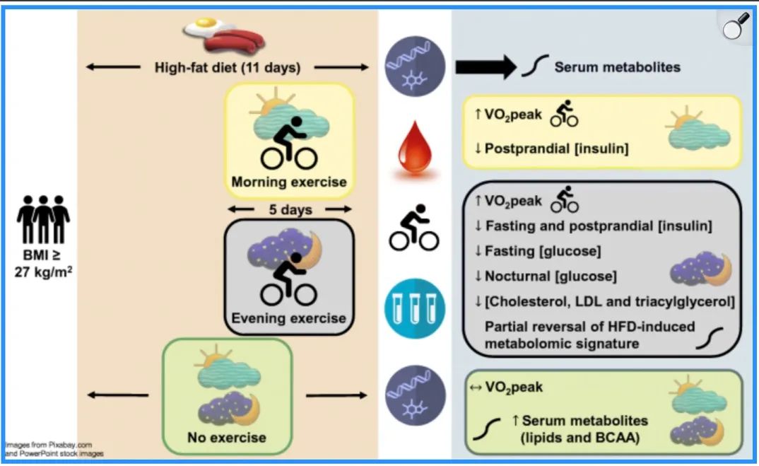 晚上6点半运动组的空腹血糖、胰岛素、胆固醇、三酰甘油和LDL胆固醇浓度都有所下降,而早上6点半运动组则无明显变化