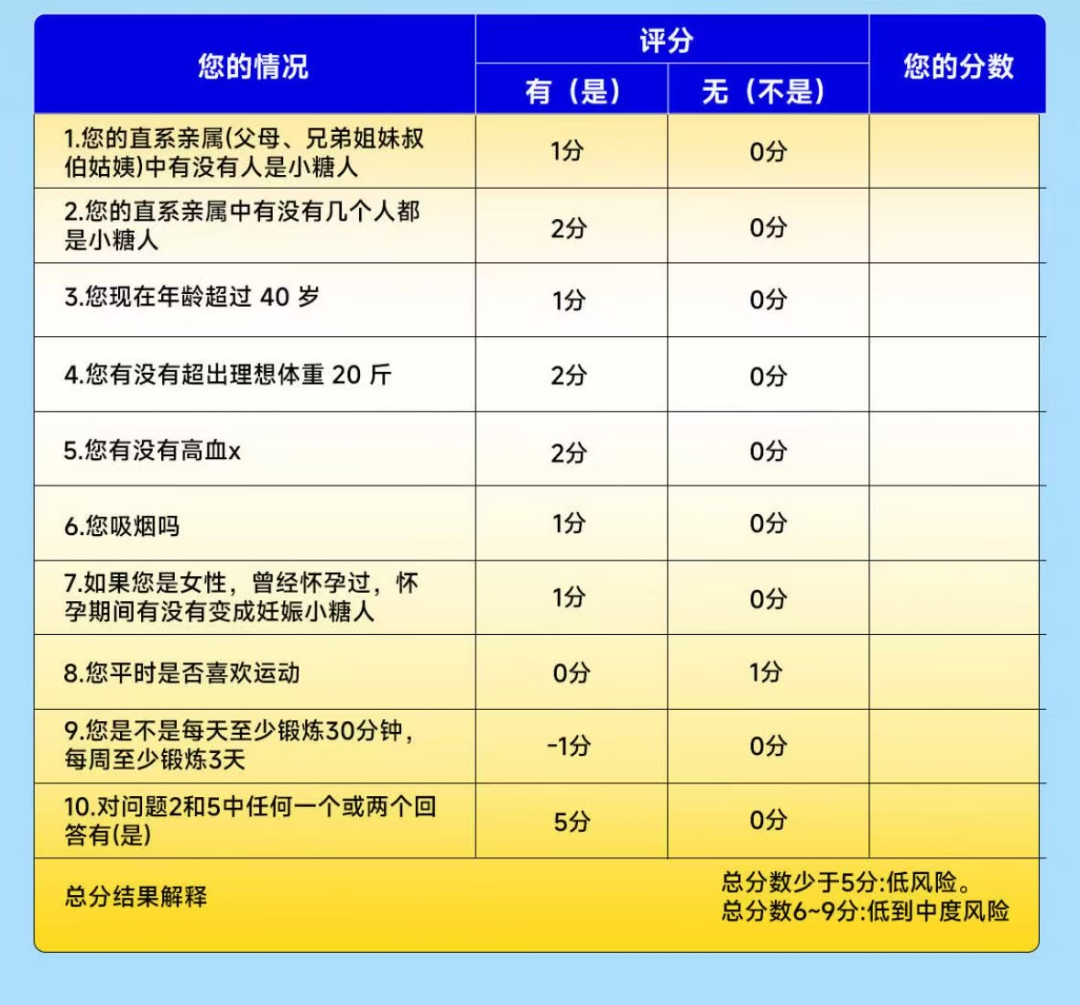 重点关注家属超重及糖前期指标,协同防控糖尿病风险!通过“糖值健康测一测”(总分6-9分需重点关注),可提前识别家人是否处于糖前期或高危状态。