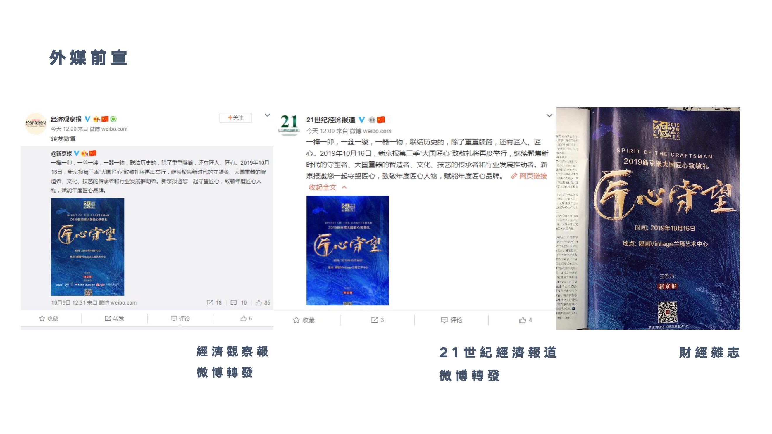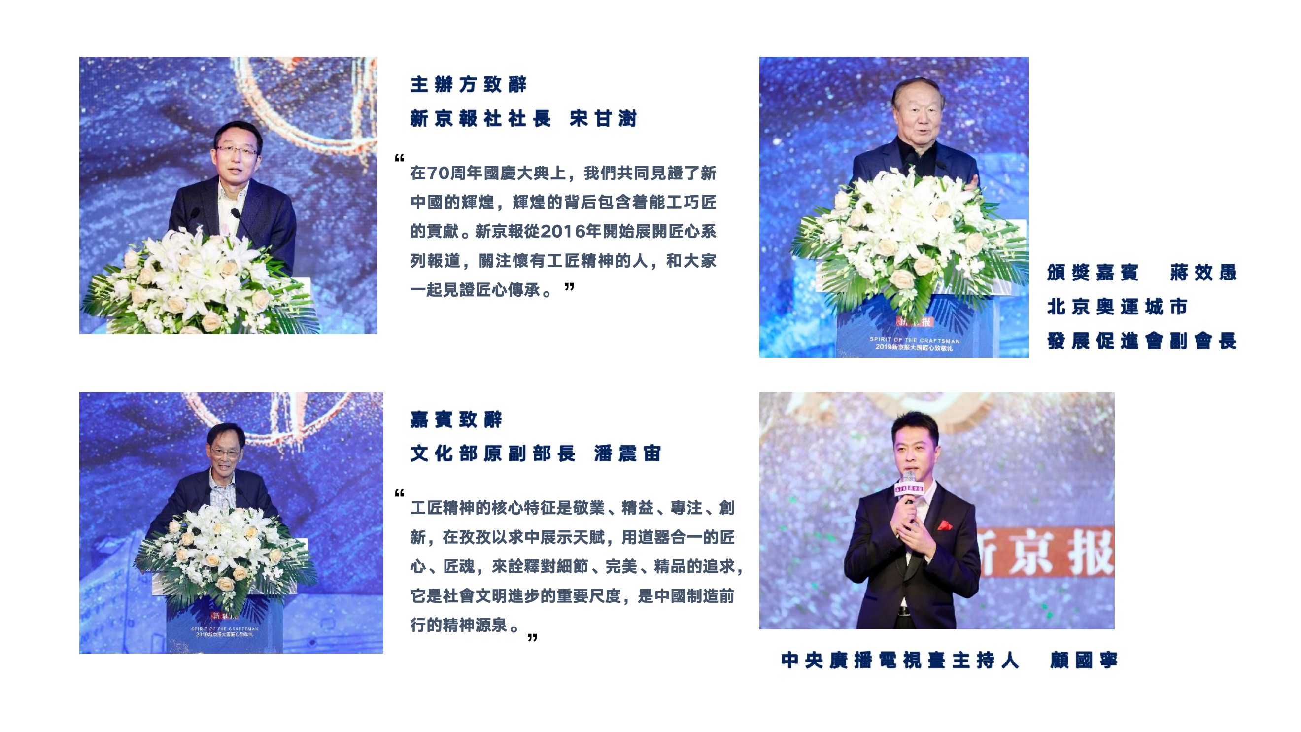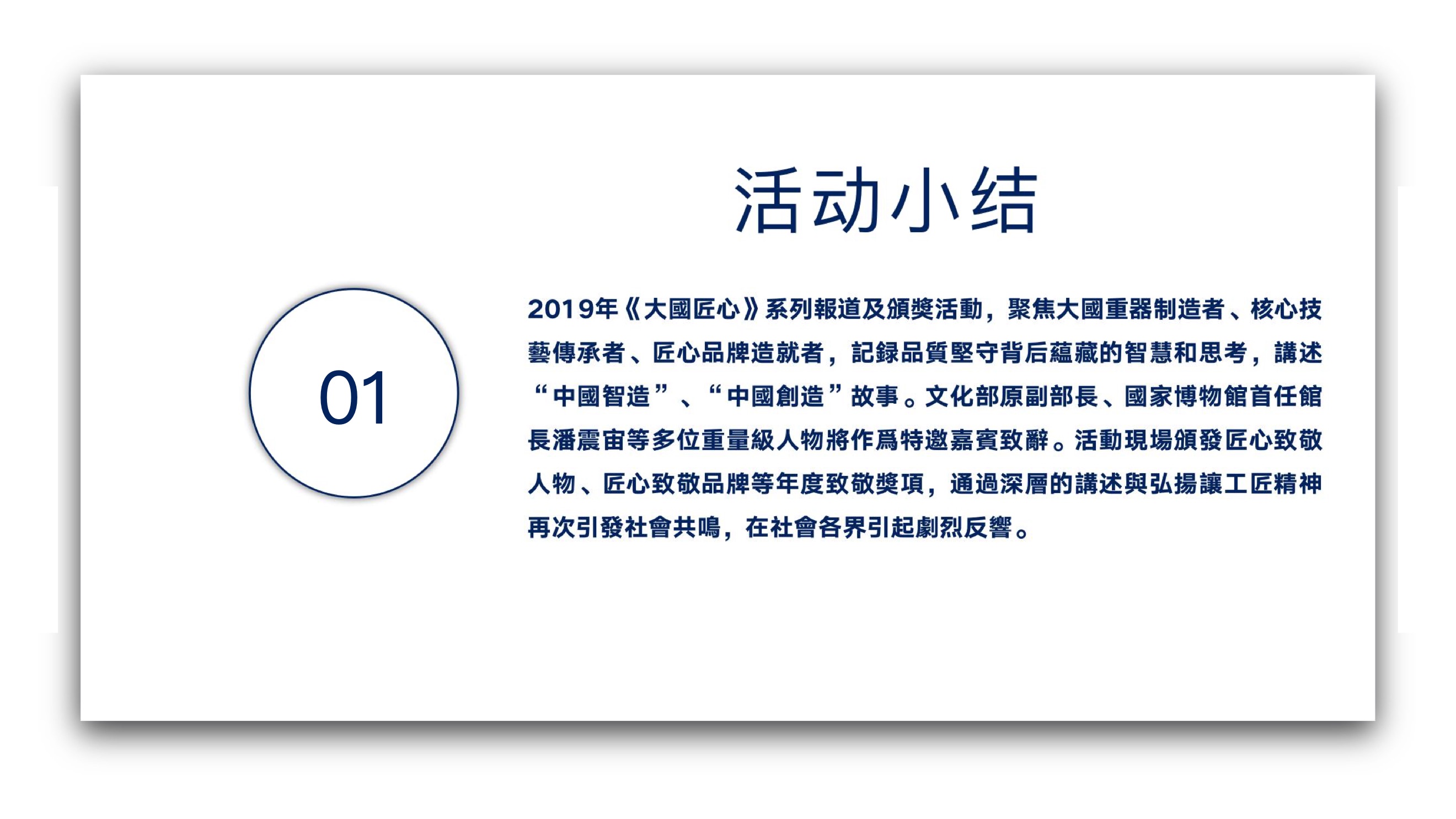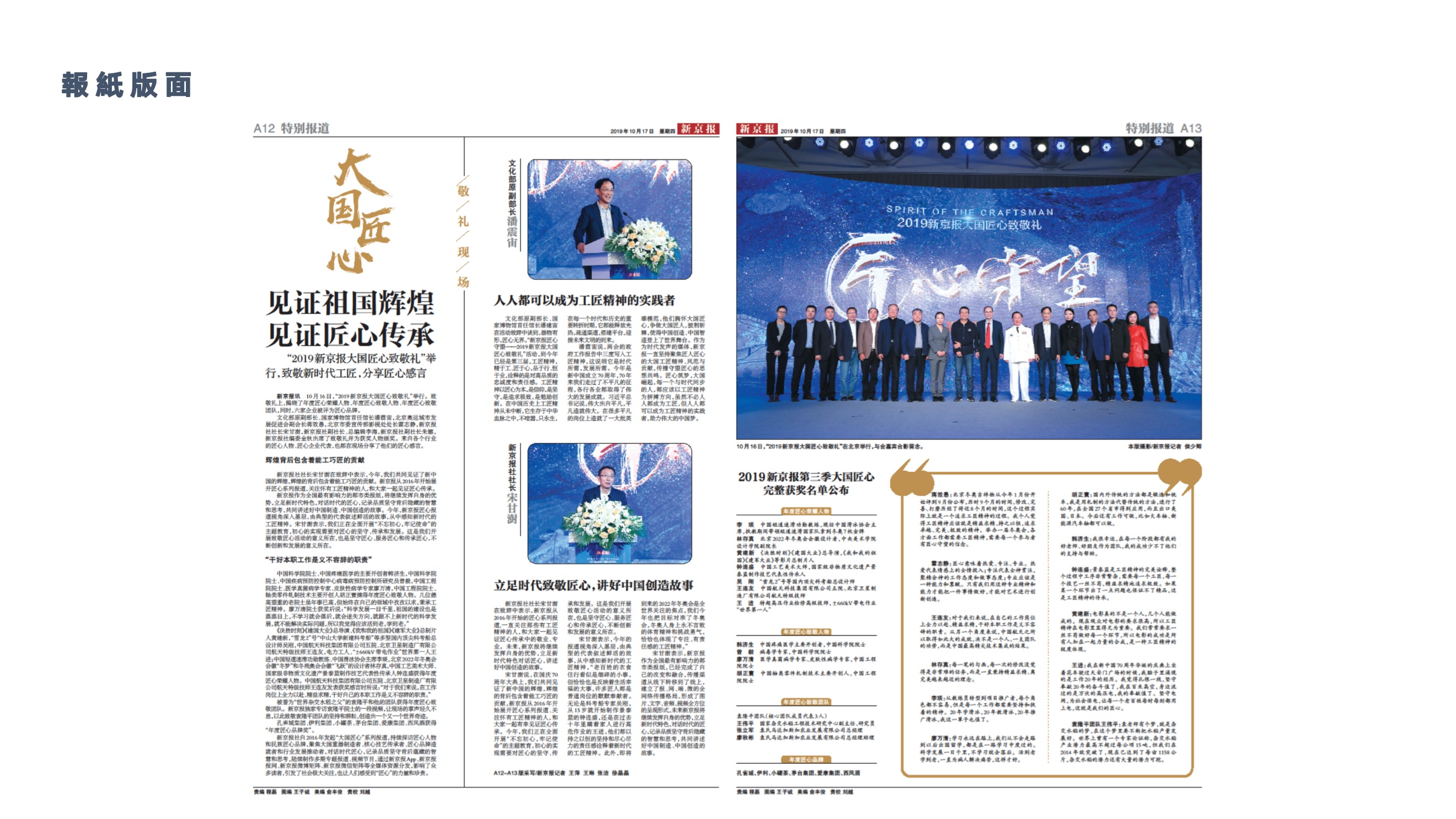 《大国匠心》系列报道及颁奖活动,聚焦大国重器制造者、核心技艺传承者、匠心品牌造就者,记录品质坚守背后蕴藏的智慧和思考,讲述“中国智造”、“中国创造”故事。活动现场颁发匠心致敬人物、匠心致敬品牌等年度致敬奖项,通过深层的讲述与弘扬让工匠精神再次引发社会共鸣,在社会各界引起剧烈反响。