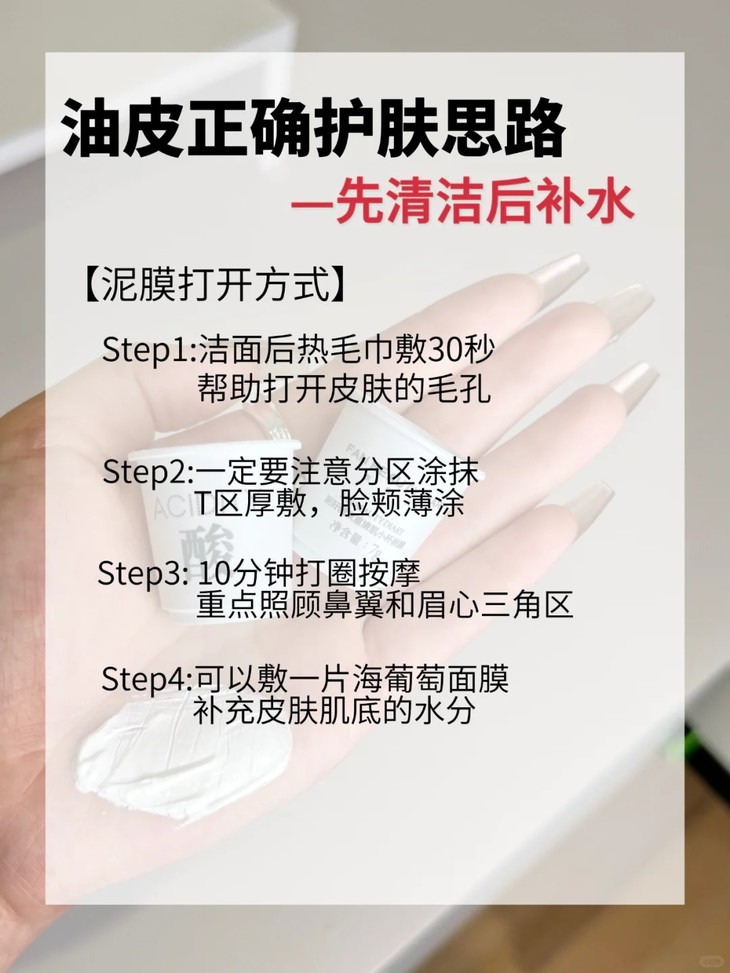 洁面后热毛巾敷30秒→T区厚敷/脸颊薄涂→10分钟打圈按摩洗掉→敷片补水面膜