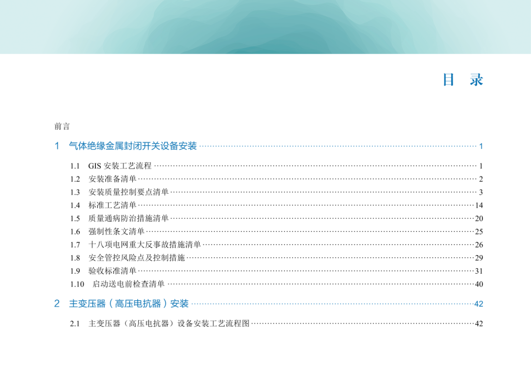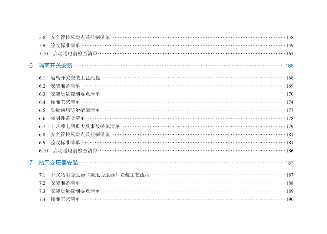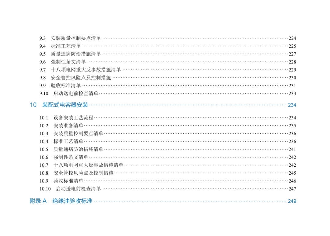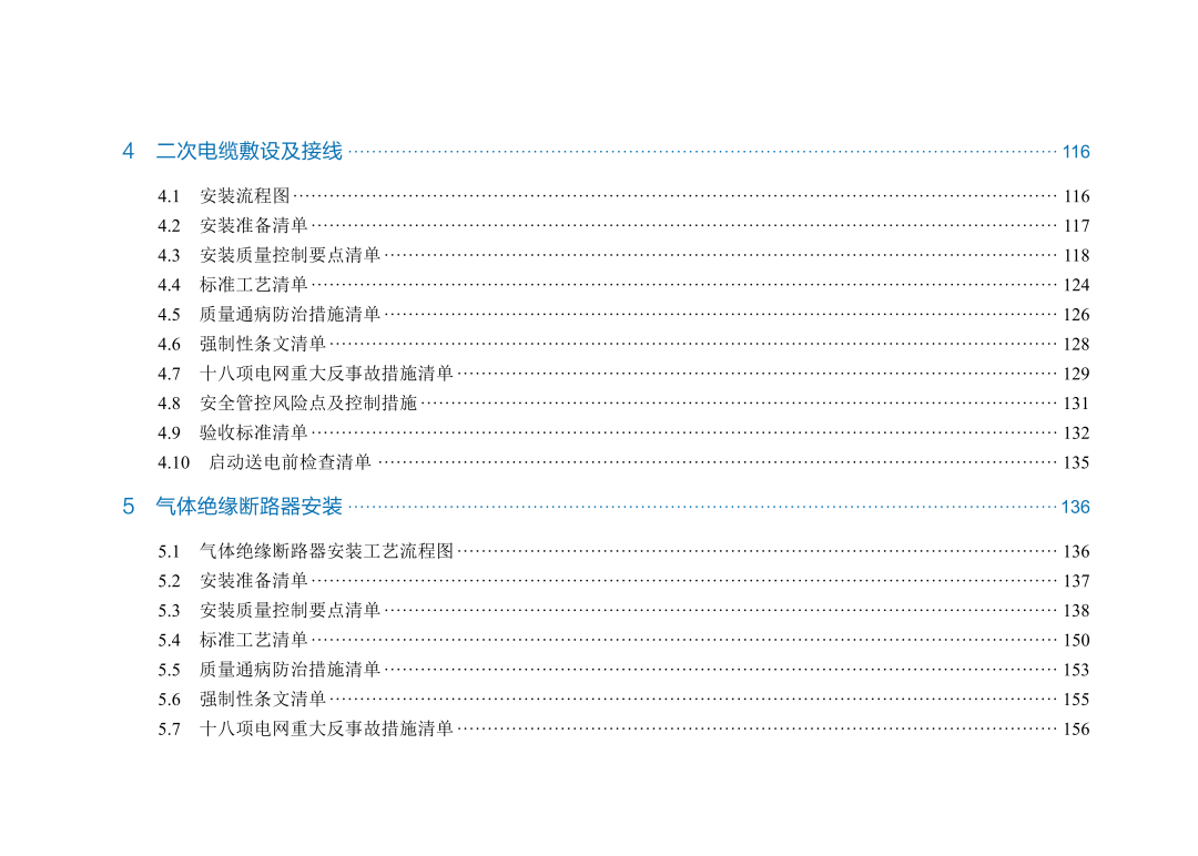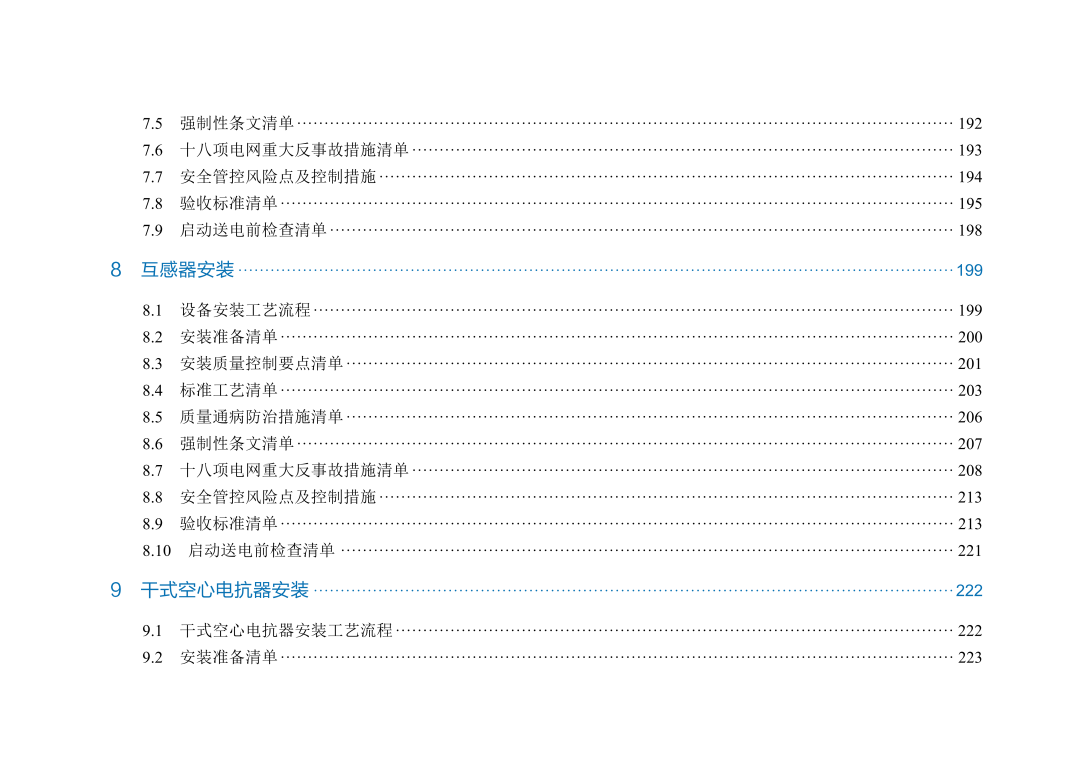 共包括10章,分别是气体绝缘金属封闭开关设备安装、主变压器(高压电抗器)安装、二次屏柜安装、二次电缆敷设及接线、气体绝缘断路器安装、隔离开关安装、站用变压器安装、互感器安装、干式空心电抗器安装和装配式电容器安装。