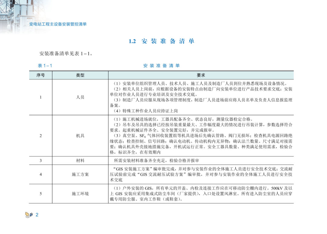 本书结合相关标准、规定,以清单的模式,整合资源,介绍各种主设备安装工作所需清单,包括设备安装工艺流程图、安装准备清单、安装质量控制要点清单、标准工艺清单、质量通病防治措施清单、强制性条文要求、国家电网有限公司十八项电网重大反事故措施清单、安全工作规范清单、验收标准清单(国家电网公司变电验收通用管理规定)、启动送电前检查清单。