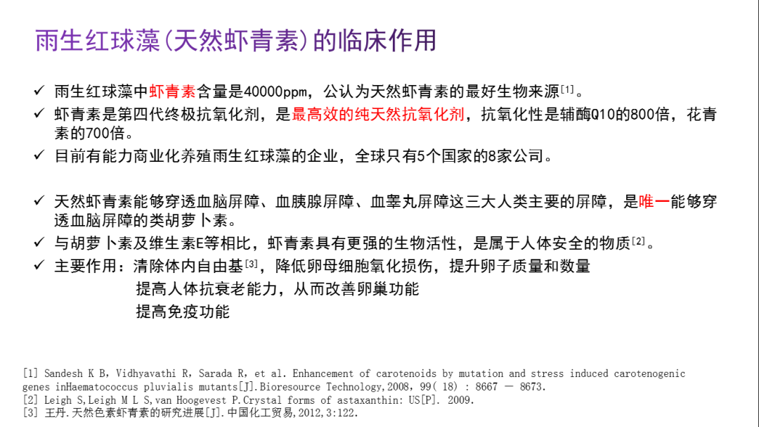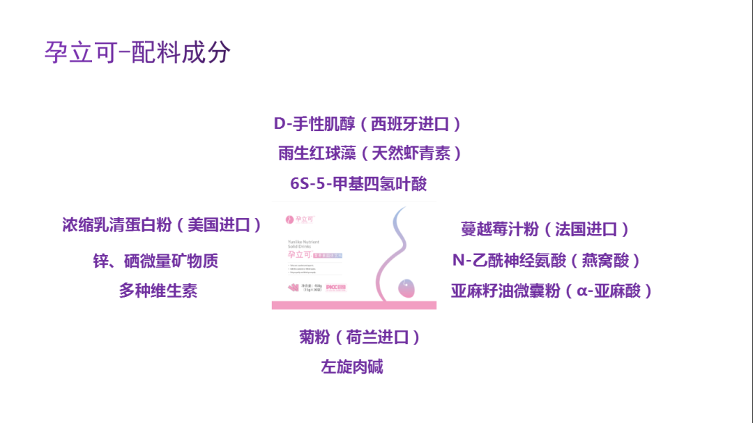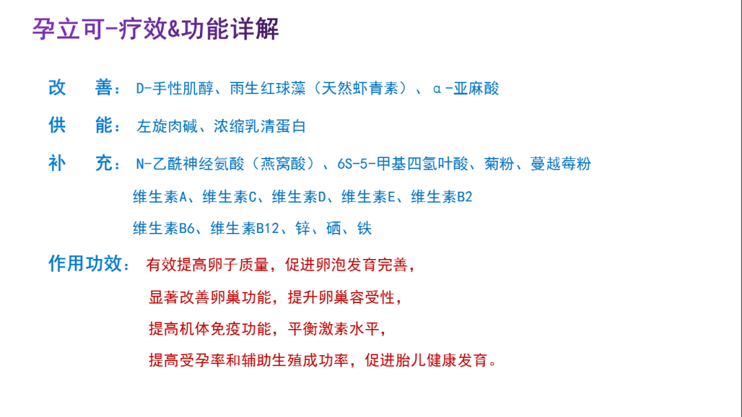 孕立可——是国内唯一含进口DCI、天然虾青素及活性叶酸等成分的助孕营养素,其中主要成分:虾青素是最高效的第四代天然抗氧化剂,抗氧化性是虾青素的抗氧化能力是维生素E的550-1000倍,茶多酚的200倍、花青素的150倍、硫辛酸的75倍、辅酶Q10的800倍。
