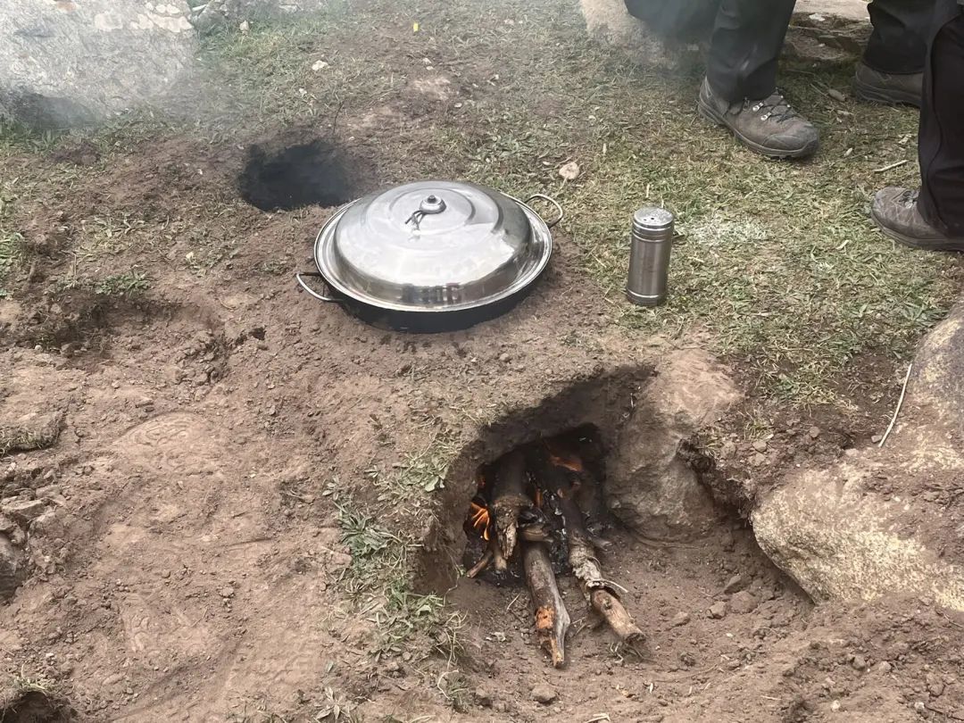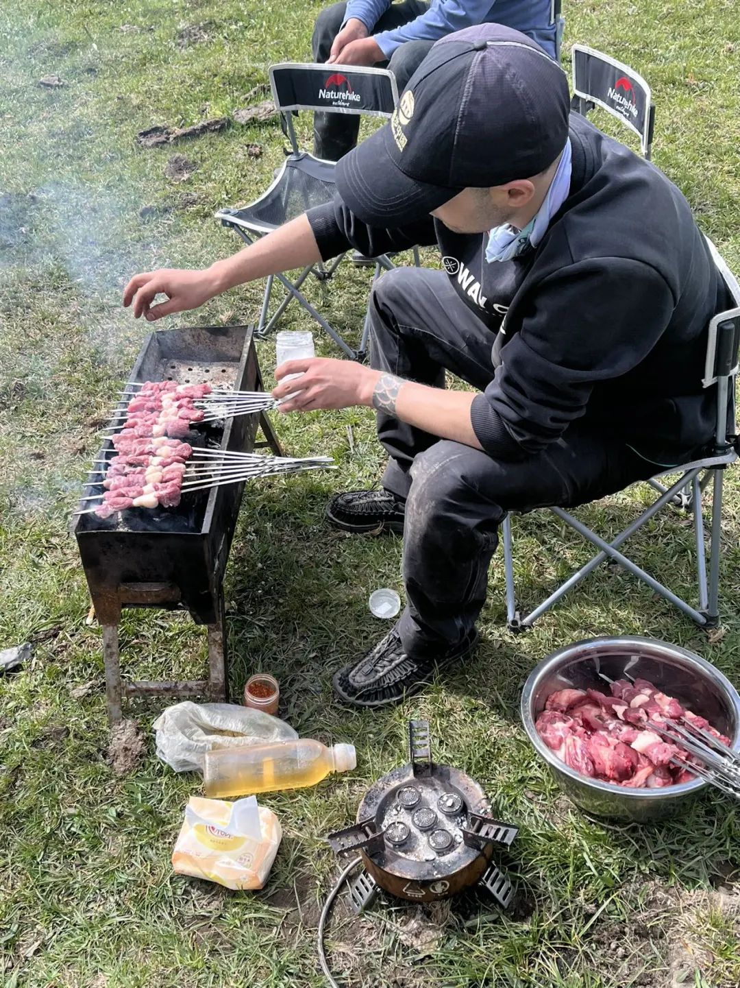 回到营地,发现几个没去老虎口的队友都围在一起,走近一看----上午宰的羊,下午已经上烧烤架了。