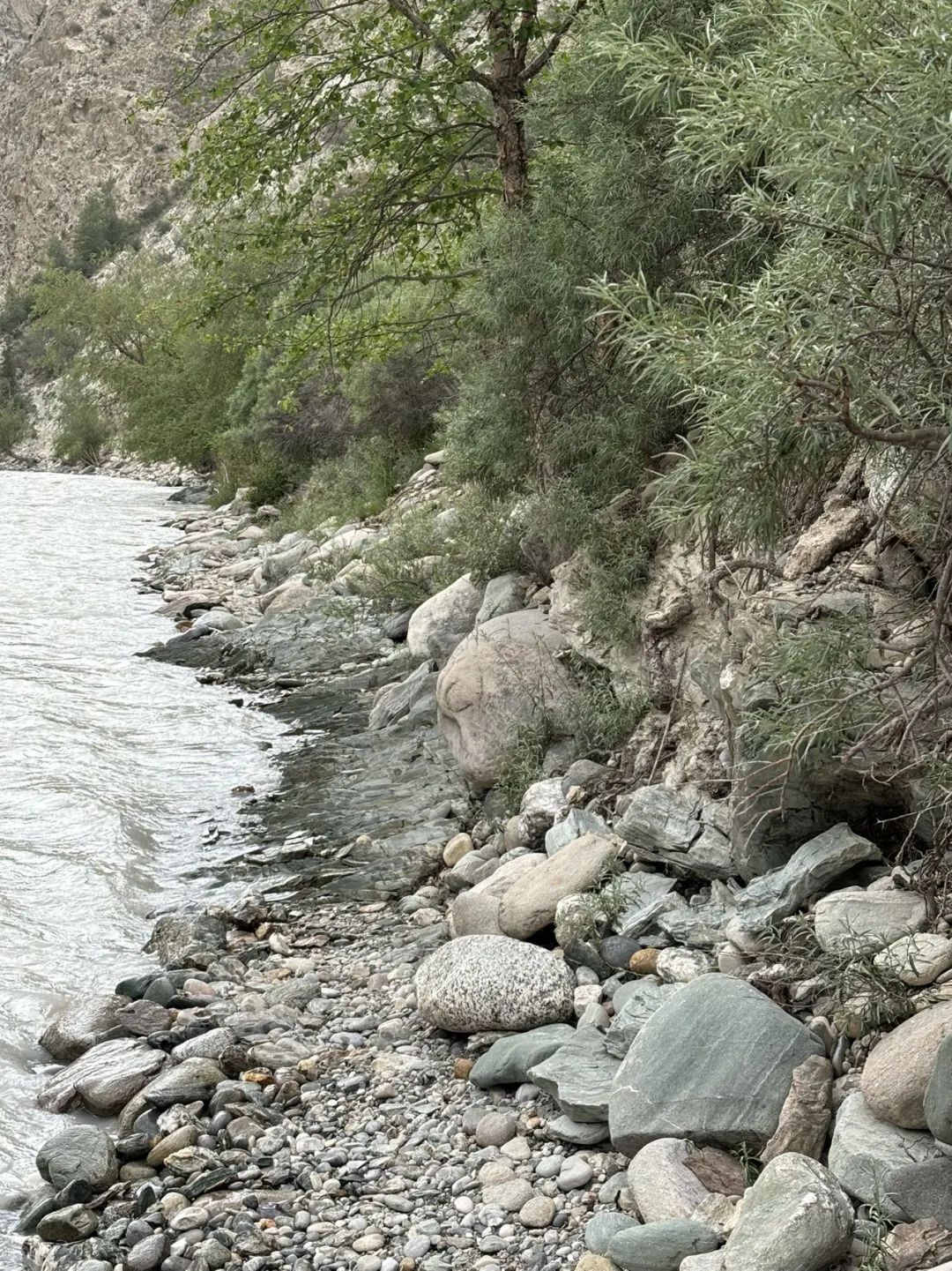 从碎石坡,到草甸,再到河滩上的机耕道和无数次过河。实不相瞒,景色越来越普通,好像到了南疆真的就变得荒凉了。