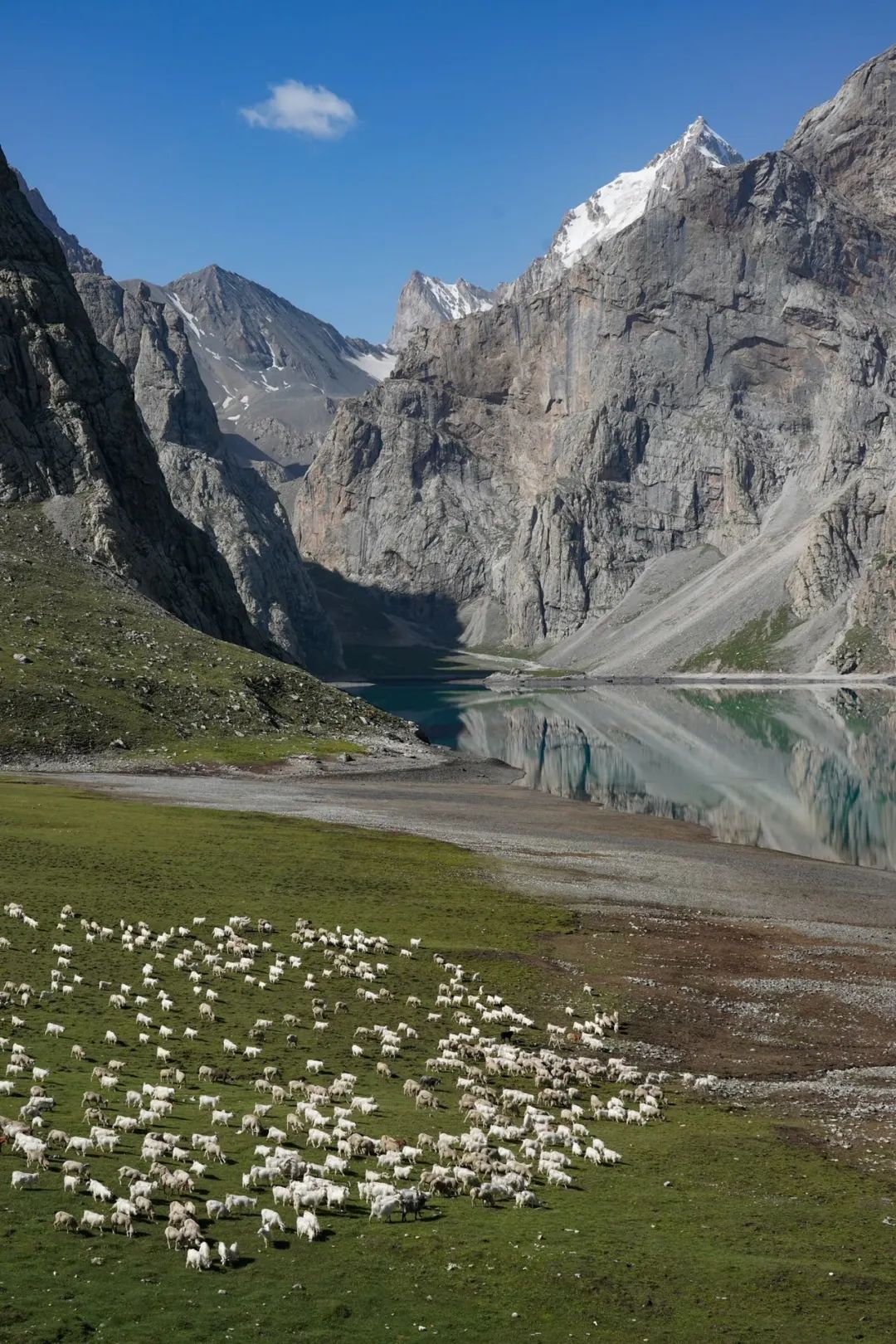 但是这地方是真好看啊。雪山,草地,羊群,当所有元素都聚集在天堂湖边,怪不得有人愿意花3w坐直升机只为看到天堂湖。