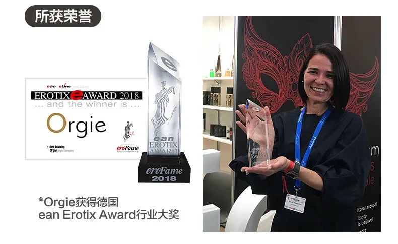 目前,Orgie品牌已经相继斩获了2018年EAN最佳情趣品牌奖,2019最佳XBIZ产品包装设计奖,以及2019年EAN最佳情趣产品奖。