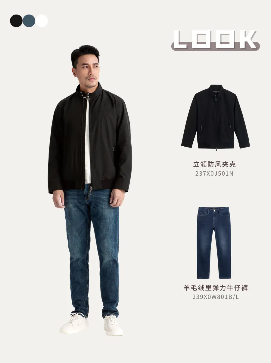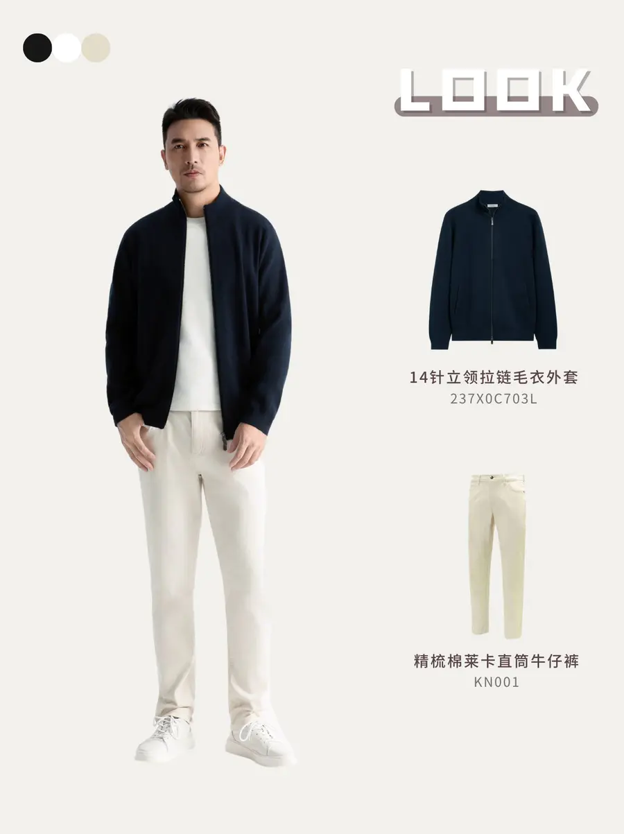 黑色毛衣外套加下装一条浅色牛仔裤,
