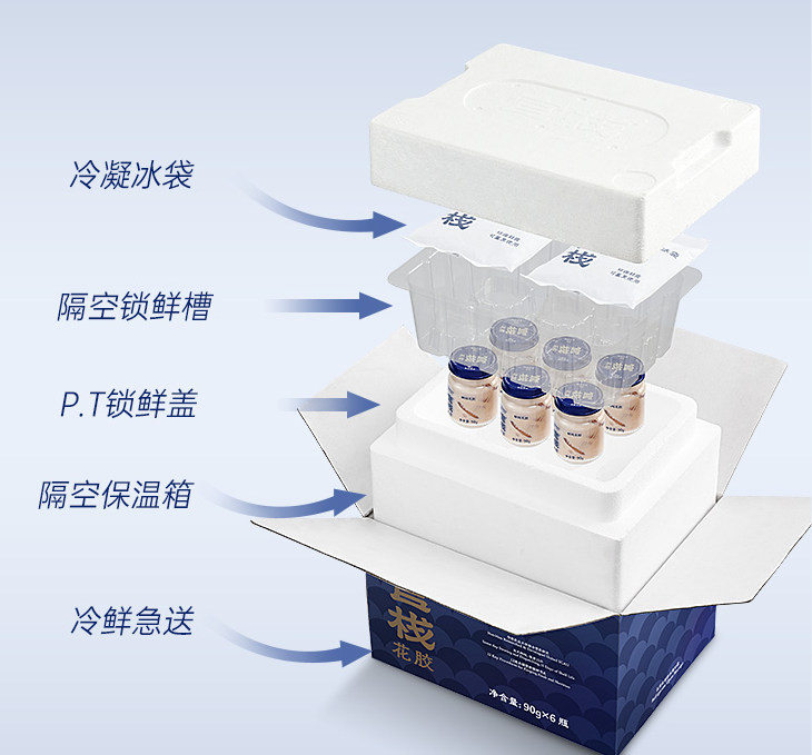 干花胶中含有天然胶原蛋白(84.6%)、弹性蛋白(5%)、透明质酸钠,官栈鲜炖花胶,甄选黄金上胶部位,Q弹大块,胶质浓厚营养高