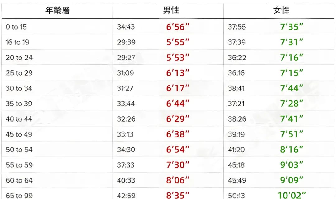 我们来看看健康人群中,不同年龄段男女跑者完成5公里所需时间是多少。