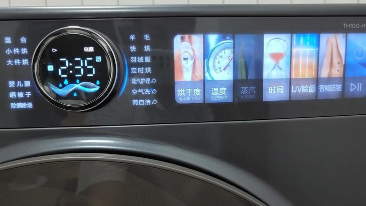 洗衣机、烘干机的操作面板采用的是左旋钮+右全彩触摸屏设计,左侧旋钮选择洗涤程序,右侧触摸屏可以调节洗涤参数,旋钮的阻尼感很不错,搭配的旋钮声音操作起来很舒服。