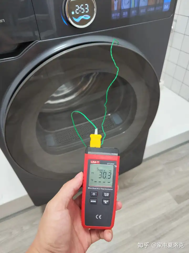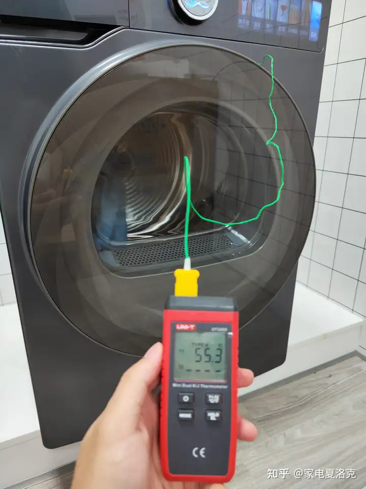 内置温度、湿度双传感器,支持精控低温烘技术,小天鹅宣传是平均温度为42℃,但没有给出最高温度是多少,我们通过测温仪记录到本色烘干机最高温度不超过56℃,属于低温柔烘。