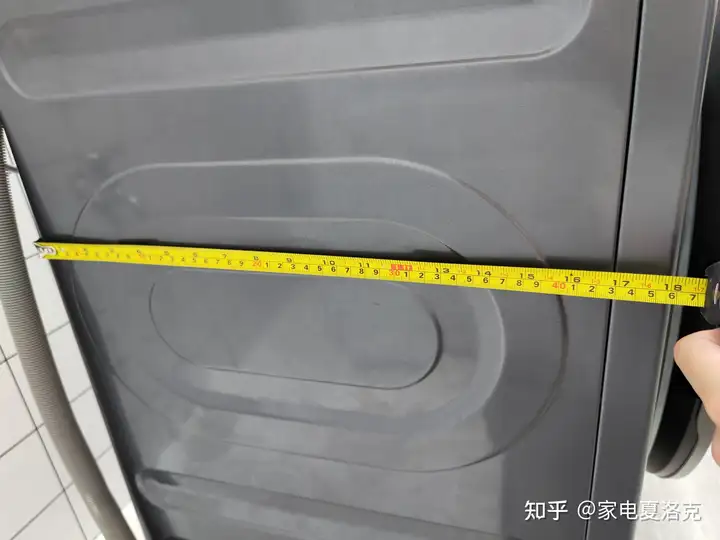 测量机身厚度只有46cm,加上门窗厚度大概49cm,市场主流的滚筒洗衣机机身加上门窗的厚度都要达到60cm,所以本色的纤薄设计非常适合家里预留尺寸不足,或者需要做特殊嵌入的家庭。