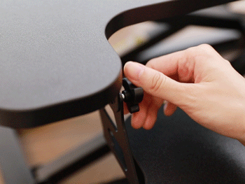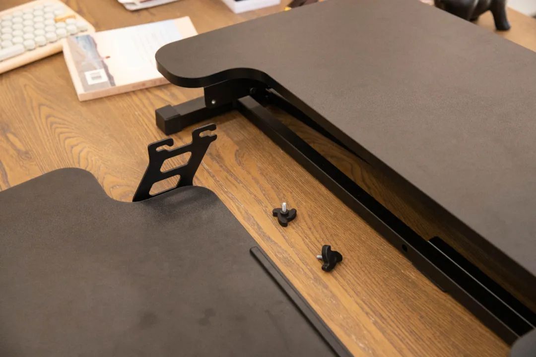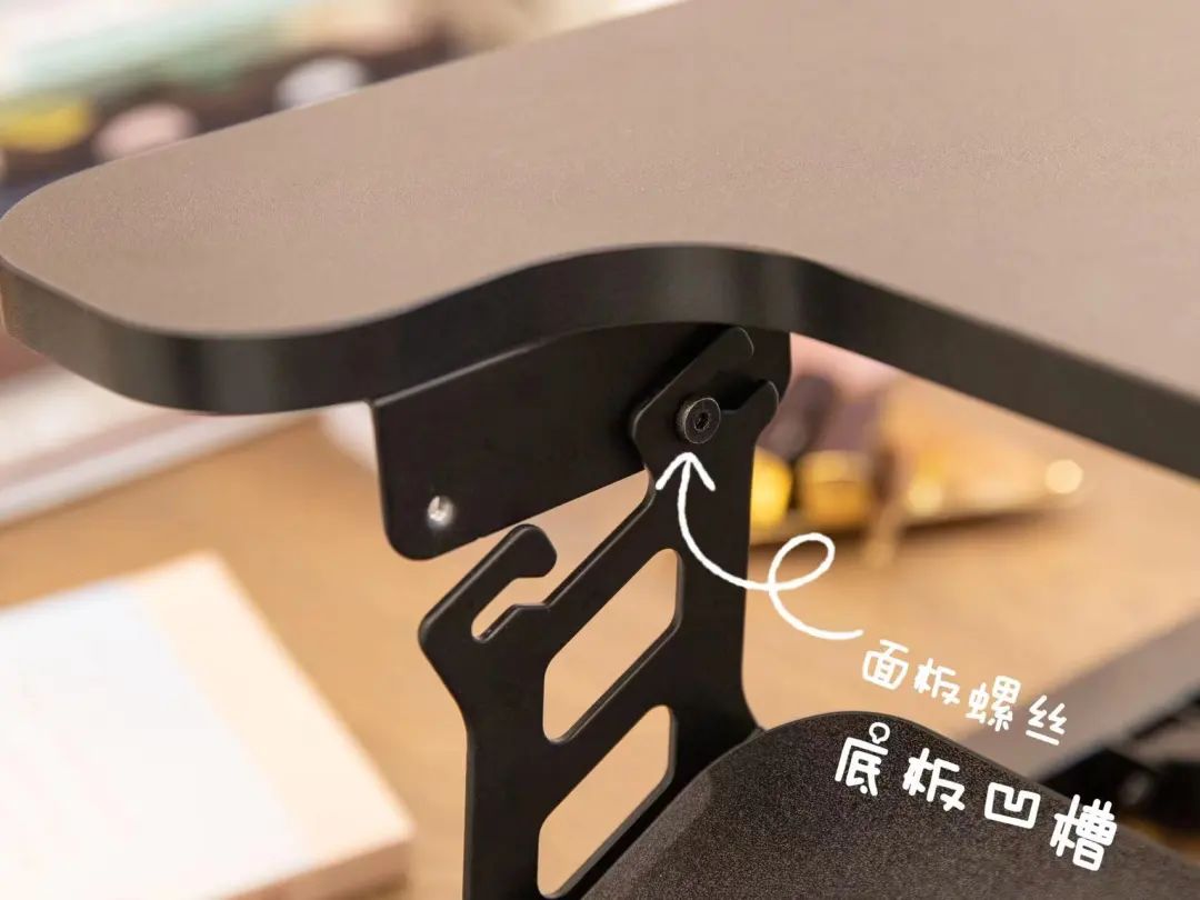 先将两边的底板的凹槽和面板的螺丝卡到位,然后拧紧另一边的螺丝就搞定啦~只需两步,就能享受办公自由啦。