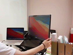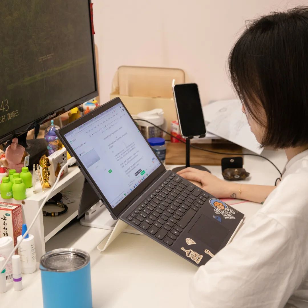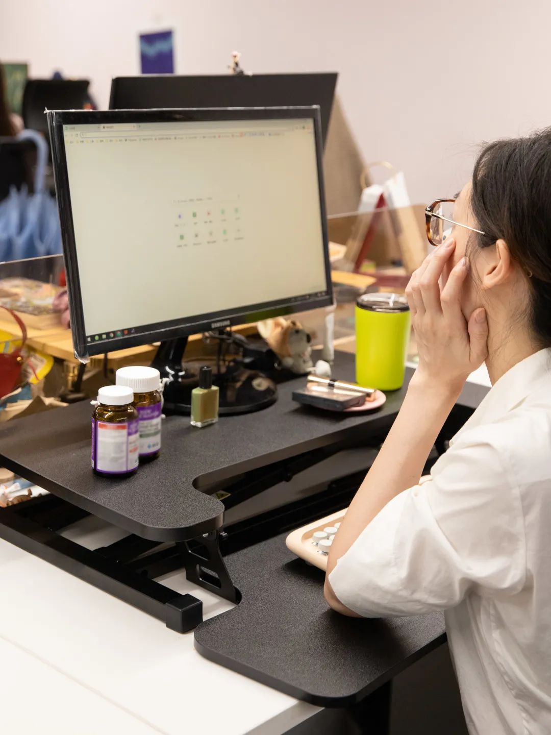这位小伙伴后来还入手了它家的摇臂,再给她的多线办公+协同办公添了一把火,高度再Up~可以看到,显示器更便于使用和展示,上下左右的多角度旋转,全公司办公最拉风非她莫属啦~