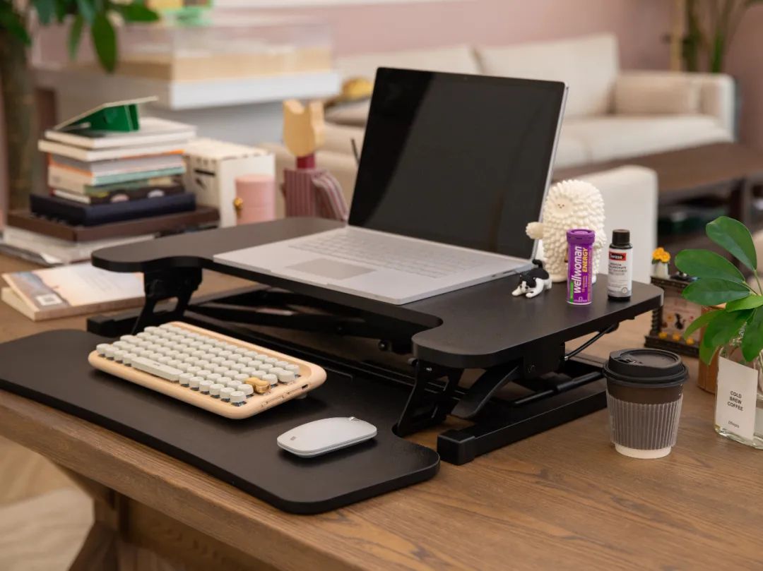 FitStand家的升降桌上放显示器+手提,就完全没问题,而且还有不少富余的位置,再放些书啊、咖啡啊、护肤小物之类的大小物件,整个桌面的布局也不会局促,工作打怪完全无需束手束脚~