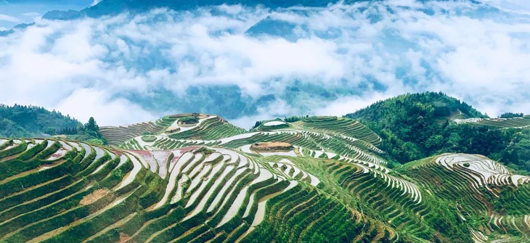 在放水节时期,层层梯田曲线丰富,在云雾间若隐若现,一畦畦蓄满水的梯田,似神灵置放在山间的镜子,顺着山坡,徐徐铺展开来。
