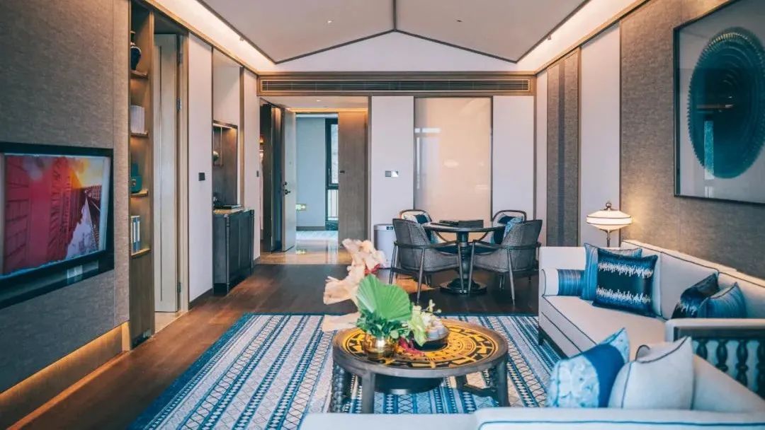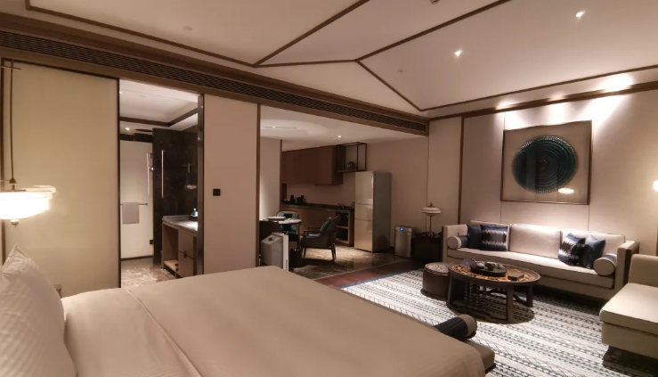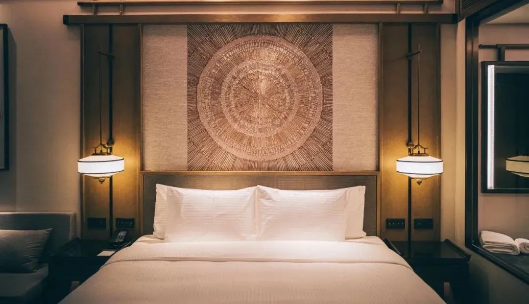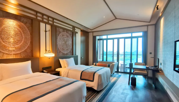 桂林融创万达嘉华酒店拥有300间客房和套房,房间设计是原生态瑶寨民居风格,总体选用淡雅清新的自然原木色系,大量使用木、棉、麻、藤等材料。