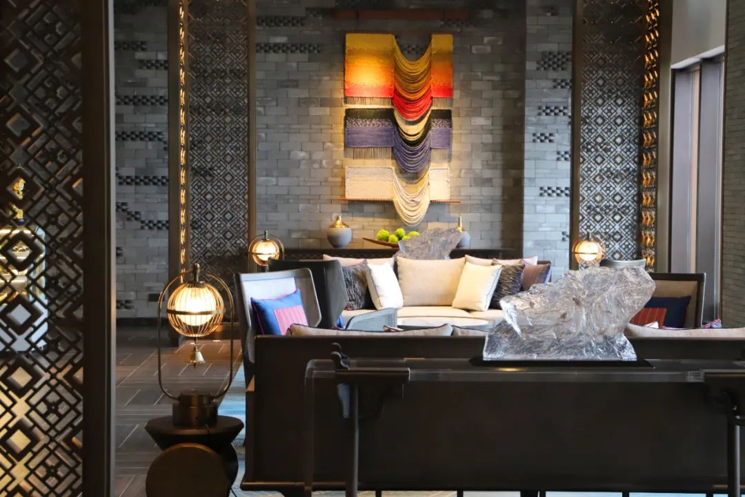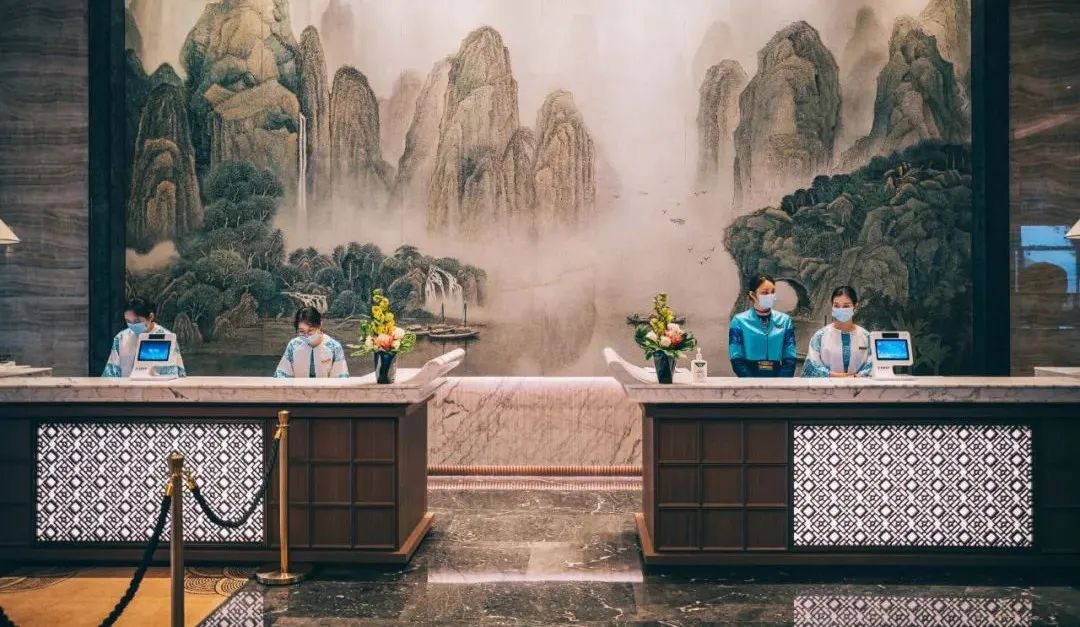 环顾大堂,广西传统手工艺术品可谓充斥着各个角落,大堂背景漓江画派风格的山水画,更是浓缩了桂林各处的名胜美景,让人分不清是人在画中,还是画在人心。
