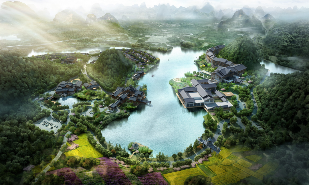 这将是一处山水间绝无仅有的世界级度假区,依山而建,曲合转折呈一字型沿湖面展开,楼层逐级出挑的吊脚楼,尽显瑶族风情~