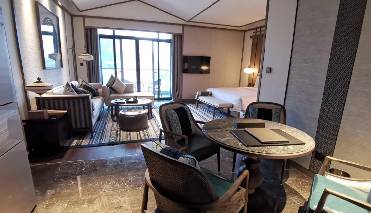 酒店为宾客提供置身山水的入住体验,300间民俗特色客房套房,均配山水阳台将四季风光纳于窗内,让日月星辰展于眼前~瑶寨民居的简约风格,与自然资源互相融合,无论是酒店外观、还是房间内部装饰,都可以感受到满满瑶族风情气息~