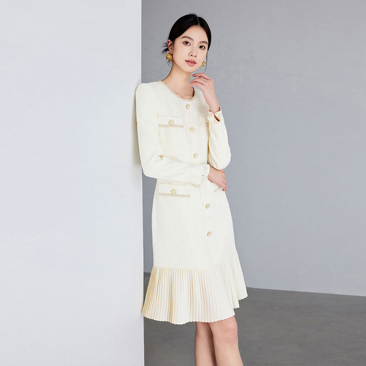 在时尚的长河中,法式小香风永远是那抹独特的存在,而这款新款米白色连衣裙,更是将法式的精致与浪漫诠释得淋漓尽致。
