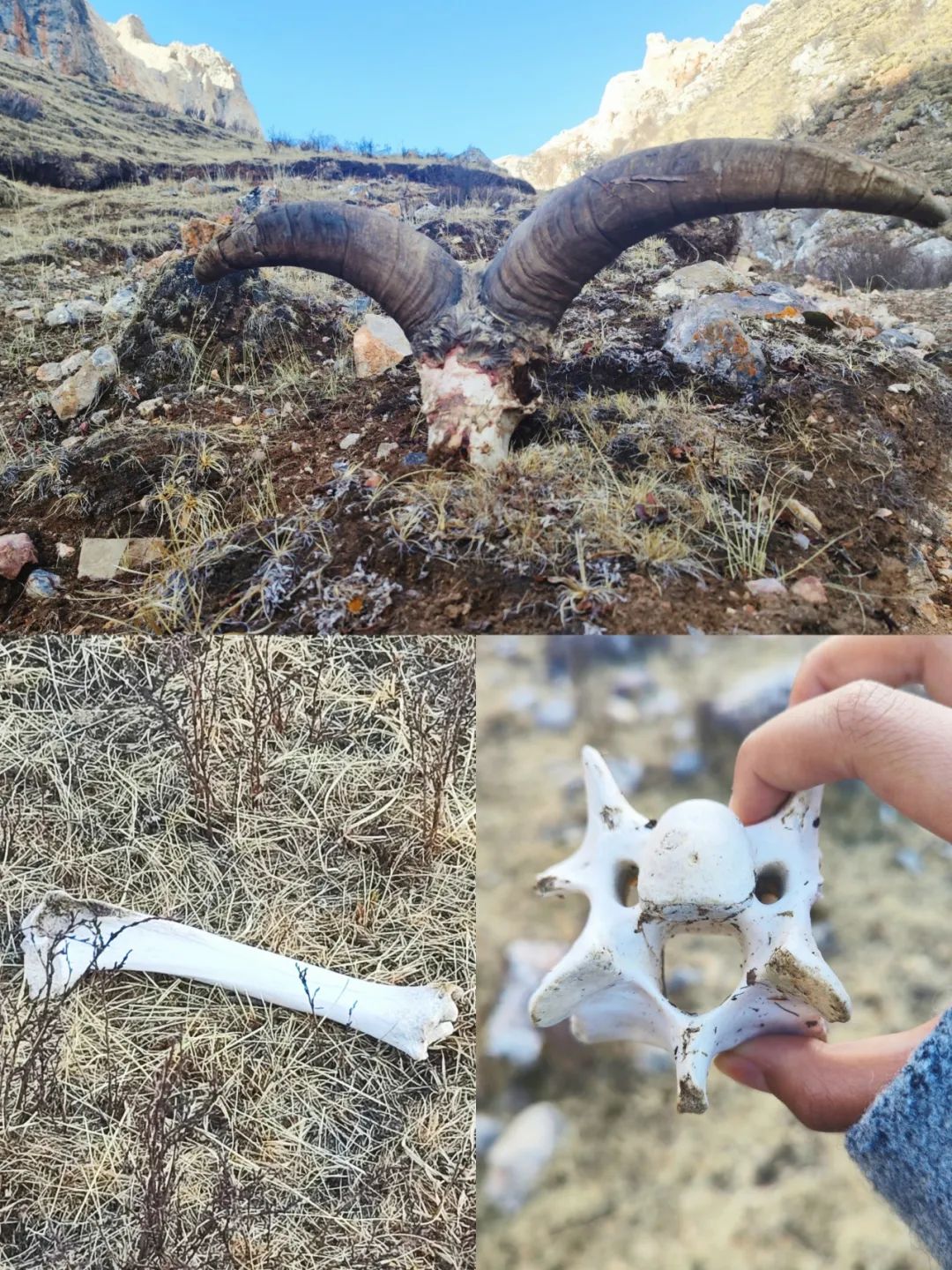 岩羊角、某兽腿骨、某兽某段脊椎骨