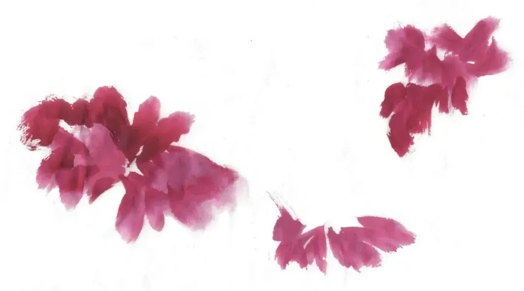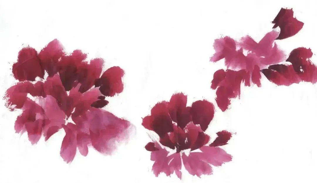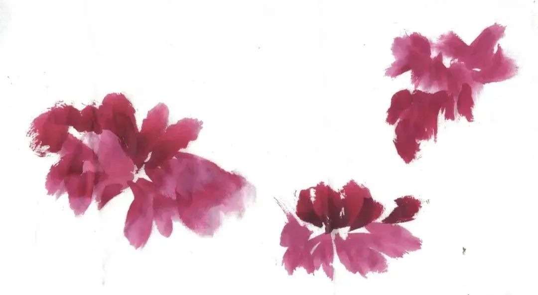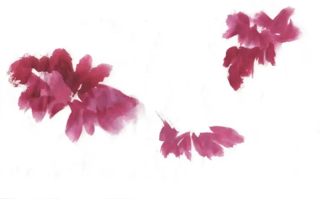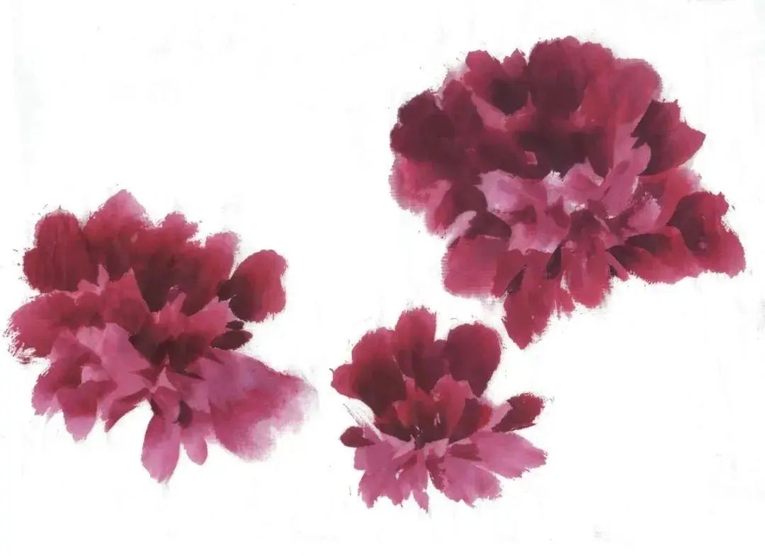 步骤二:侧锋运笔。第一笔的走势非常关键,决定了整个花头的走势。画面同时进行,三朵花之间也有主次关系,切莫雷同。