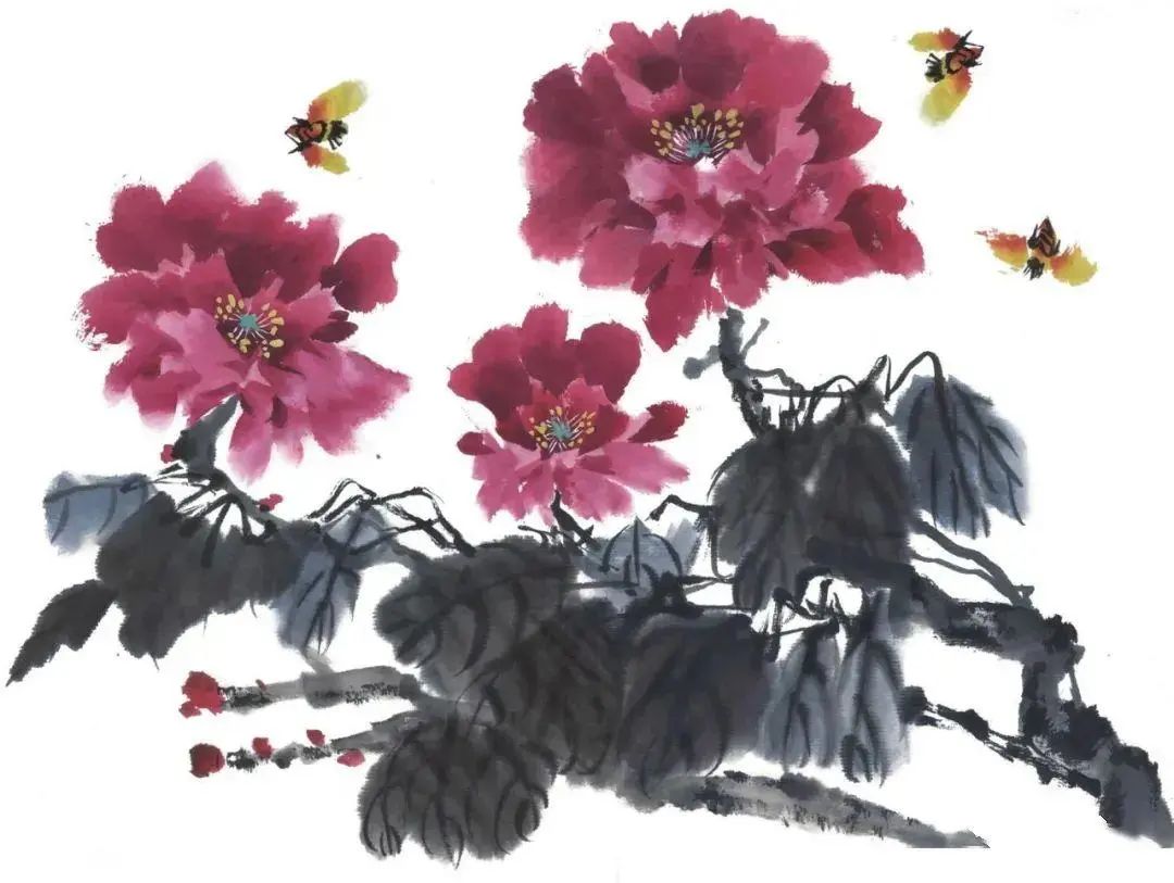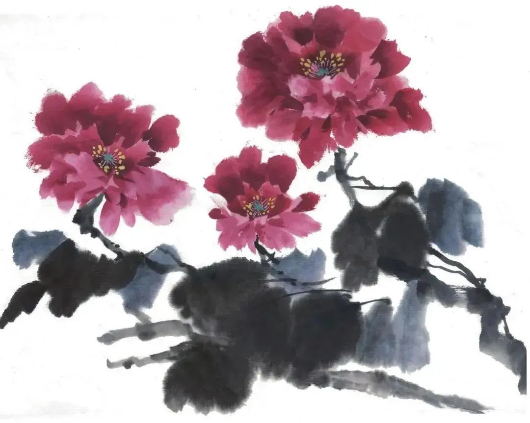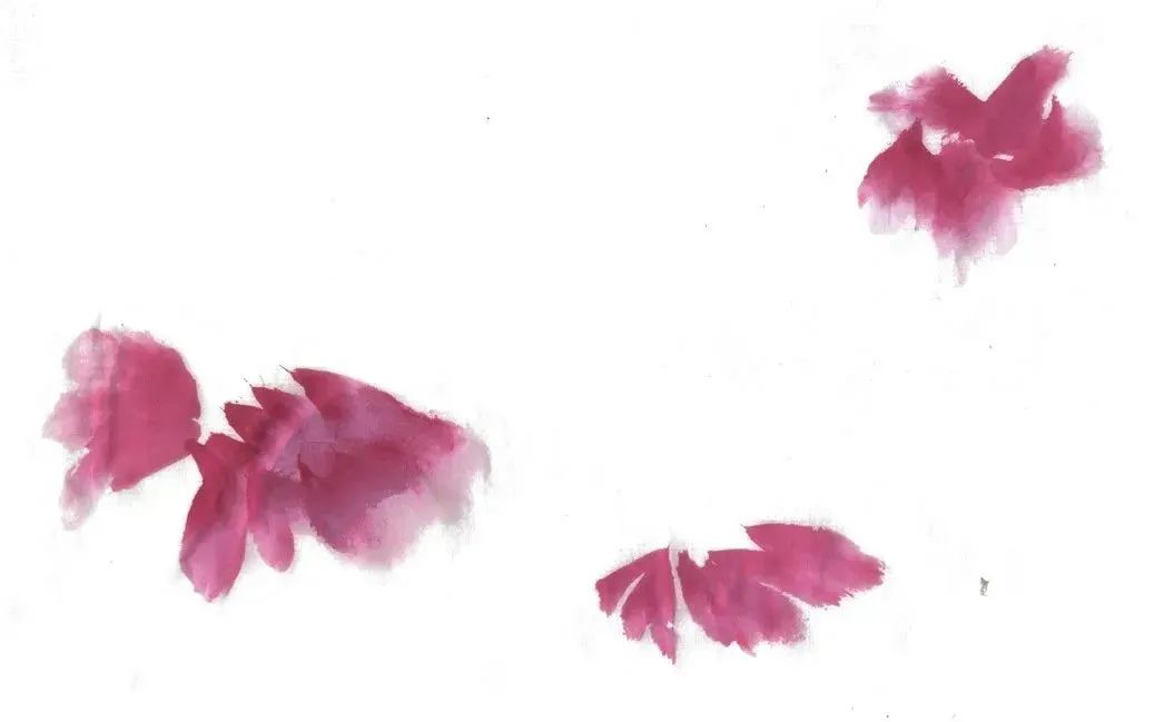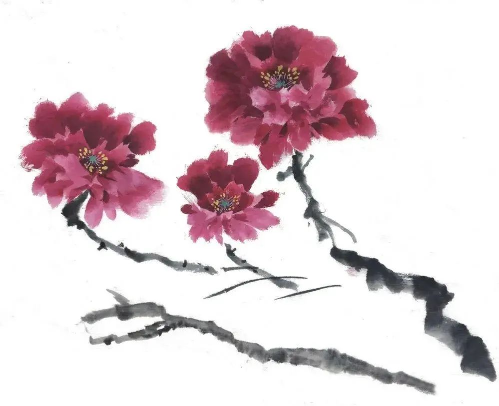 步骤二:侧锋运笔。第一笔的走势非常关键,决定了整个花头的走势。画面同时进行,三朵花之间也有主次关系,切莫雷同。