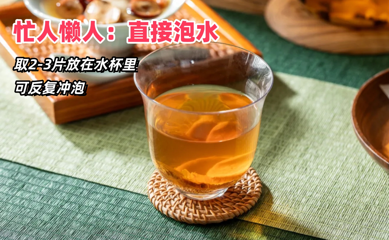 前一晚用保温杯投入2-3片红参片,加入滚水,拧紧密封一晚,第二天起床空腹喝,吸收效果更佳!气血翻涌,小困小累都没了。