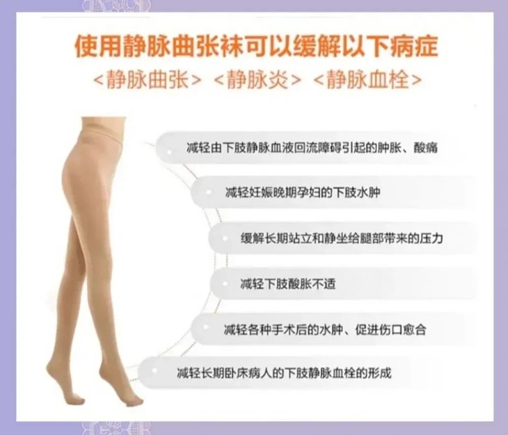 一级压力的压力袜:主要用于预防腿部沉重感、疲劳感,静脉曲张、血栓形成和栓塞及预防经济舱综合征,并可用于治疗妊娠期轻度水肿及轻度静脉曲张;