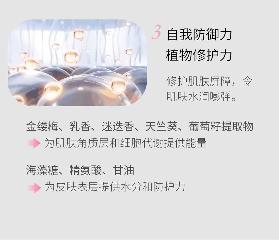特别添加金缕梅、乳香、迷迭香、天竺葵、葡萄籽提取物,为肌肤角质层和细胞代谢提供能量,能在深层清洁皮肤的同时,有效延长皮肤锁水时间,令肌肤净透舒爽。