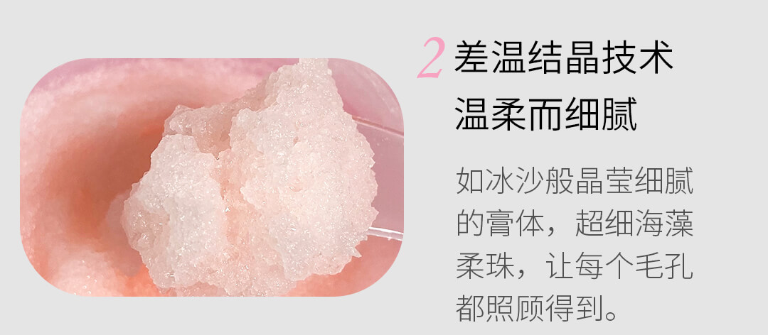 里面含有“冰沙”颗粒,实际上是由海藻胶水凝而成的柔软颗粒,自带磨砂膏的功能,轻轻搓揉肌肤,就能带走老废角质,净澈毛孔黑头,越搓越嫩滑紧致。