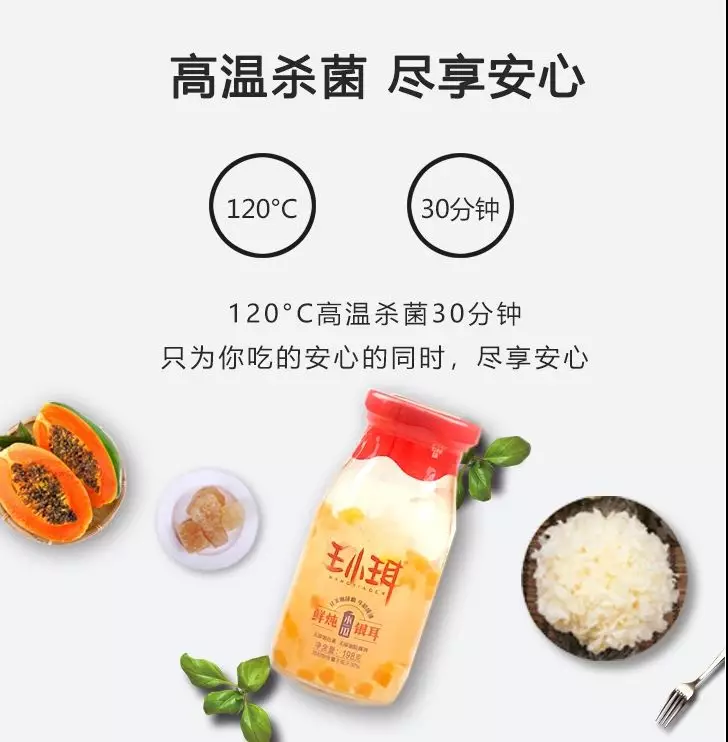 1.0防腐0添加,原汁原味,口感就像刚刚出炉的鲜银耳。每一瓶都经过了30分钟121°C高温杀菌,只为让您享用美味的同时吃的安心。