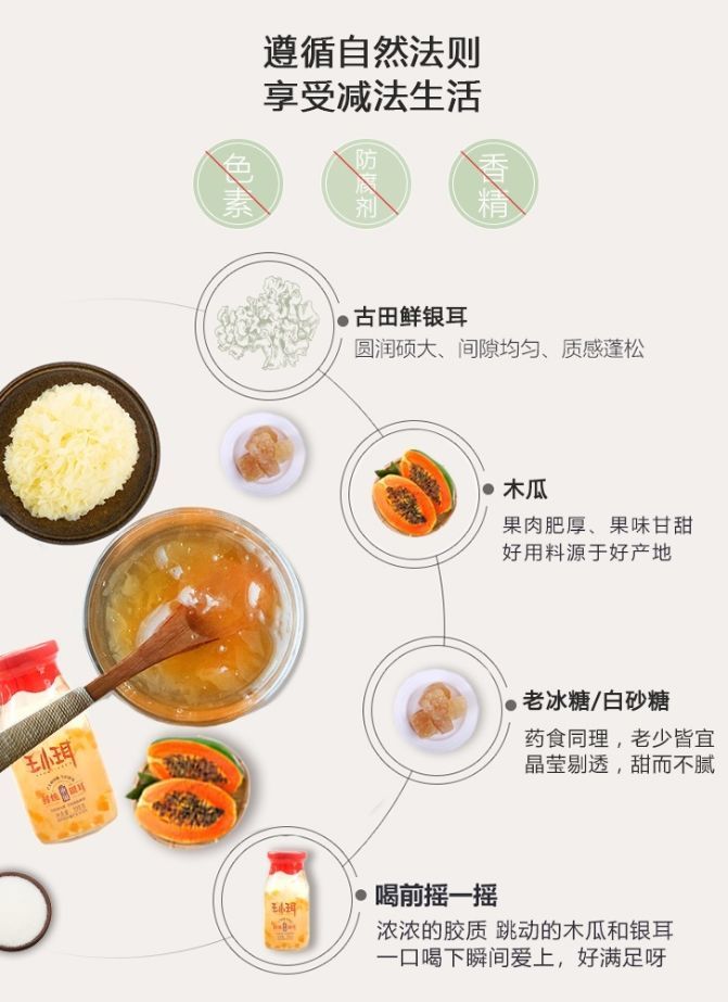 5.高膳食纤维,自然原味,加入新疆红枣,宁夏枸杞,农家冰糖;清甜木瓜味,朵朵银耳、口口果肉,滋爽进心里!