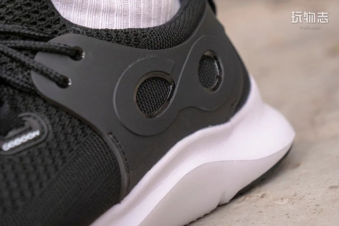 传统跑鞋鞋口偏大,也没有弧度,很容易就出现不跟脚的问题。于是咕咚这款鞋,把鞋口设计成了包裹性更强的 U 型,走跑不掉跟,把脚踝牢牢 🔒 死。
