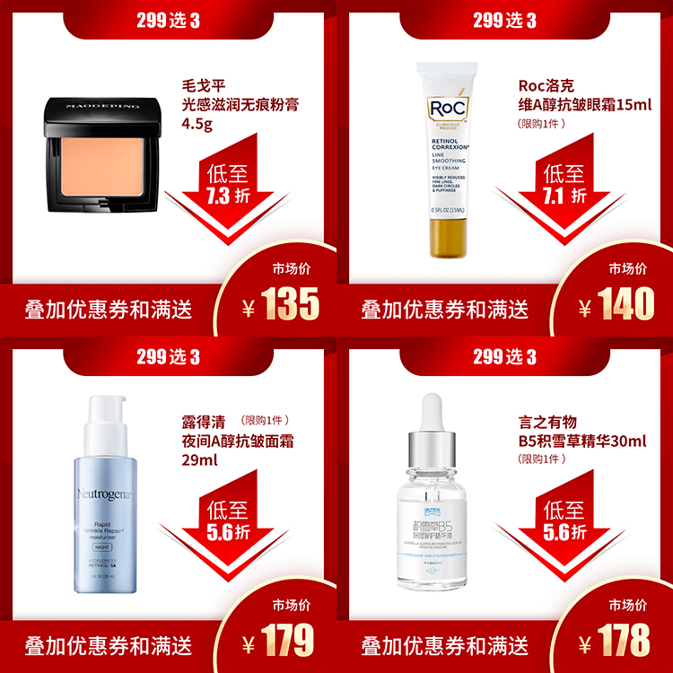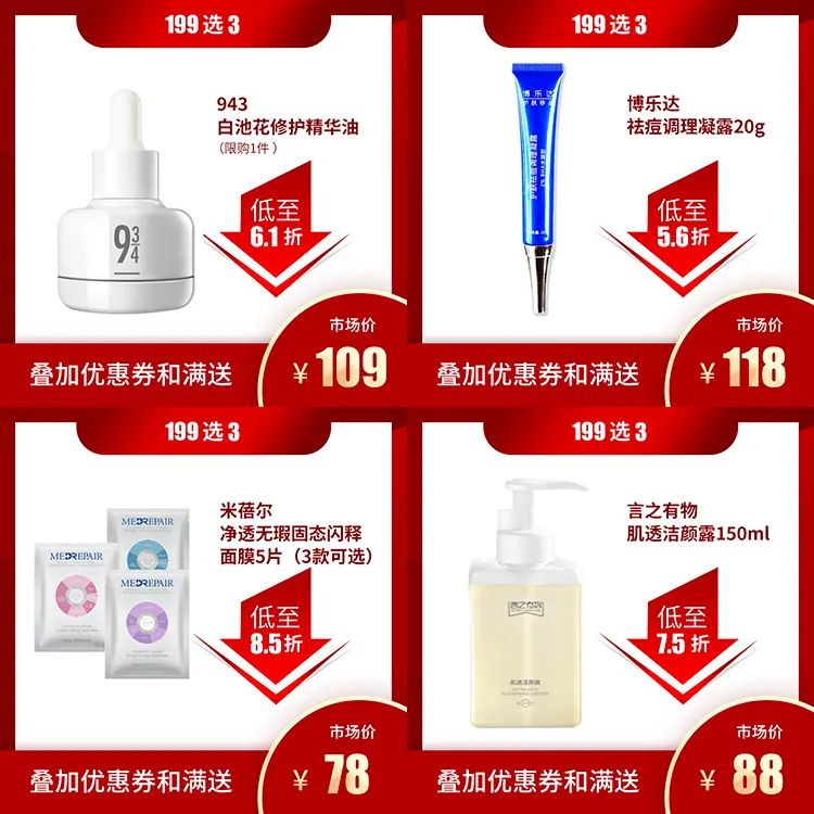光是这199选3和299选三两个区域,就能搭配出各种组合,来满足大家不同的护肤诉求!提醒一下,有一些产品是限购一件的哦,大家在下单的时候还是要理性思考,结合自己的诉求来合理搭配~