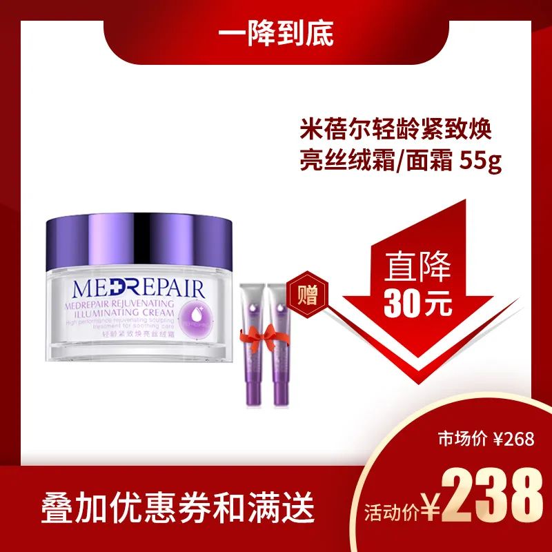 富含20%华熙生物自研山毛榉提取物的米蓓尔轻龄紧致焕亮丝绒霜,大促期间买55g正装,赠10g*2,到手75g,售价2字出头!