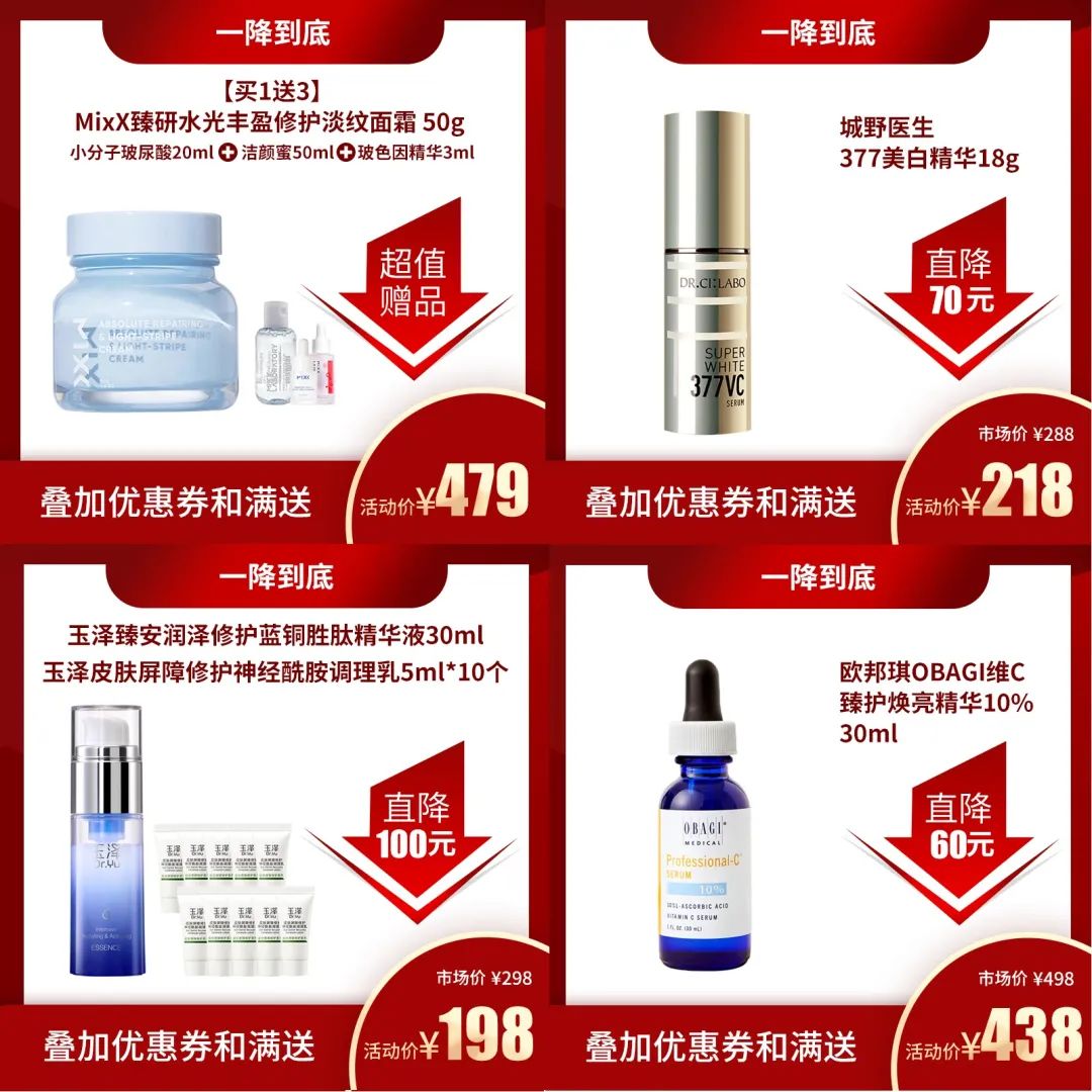 这个专区还有十一曾经买了10罐分给全家亲戚的MixX臻研水光丰盈修护淡纹面霜,把377成分带火的城野医生377美白精华,号称平替某橄榄精华的希妍萃橄榄积雪草舒颜精华液,被誉为碾压其他原型VC的欧邦琪维C臻护焕亮精华(10%),修护老牌玉泽的臻安润泽修护蓝铜胜肽精华液。