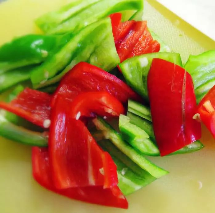 3、将青红椒切成块备用;