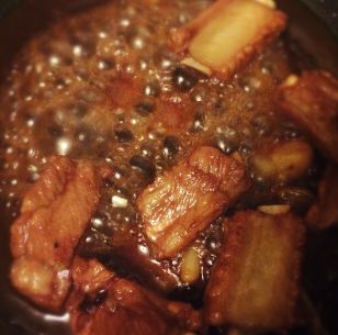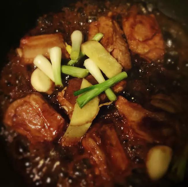 1、热锅凉油,放葱段、姜片煸香,放排骨翻炒,炒到排骨边缘有点焦,倒入1/2调好的酱汁,再继续翻炒;