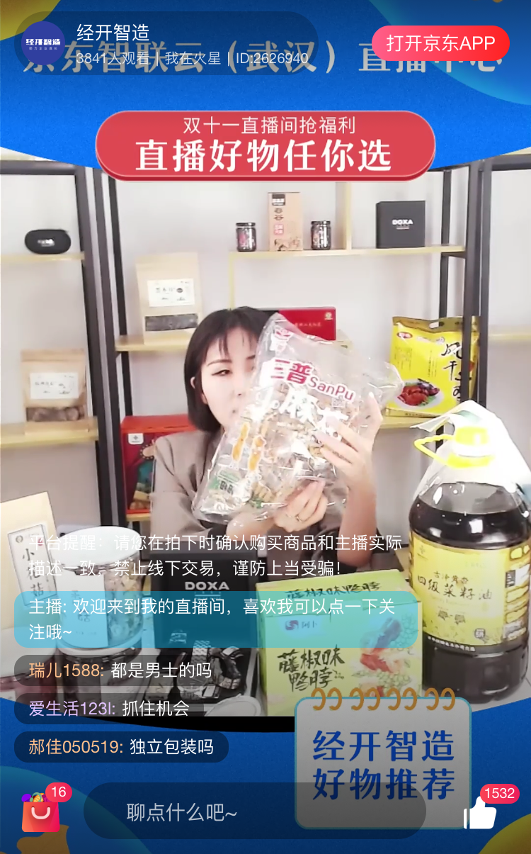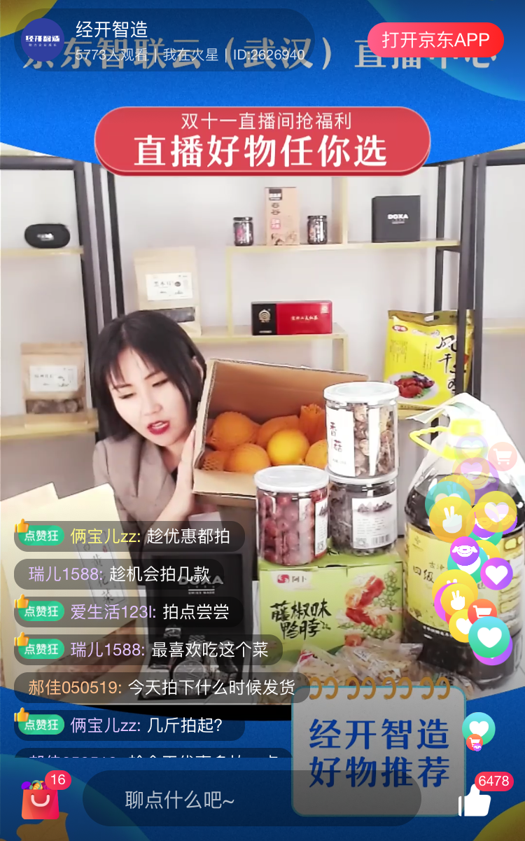 11月11日晚18:00-20:00,联手京东直播,共同为鄂带货,9.9元秒杀咸宁三普小麻花,29.9元5斤秭归九月红脐橙带回家,掀起了直播间的热潮,当晚在线观看人数及点赞数突破万人!