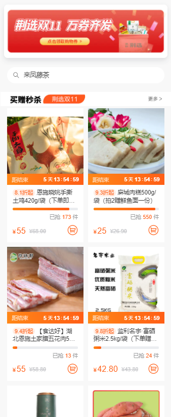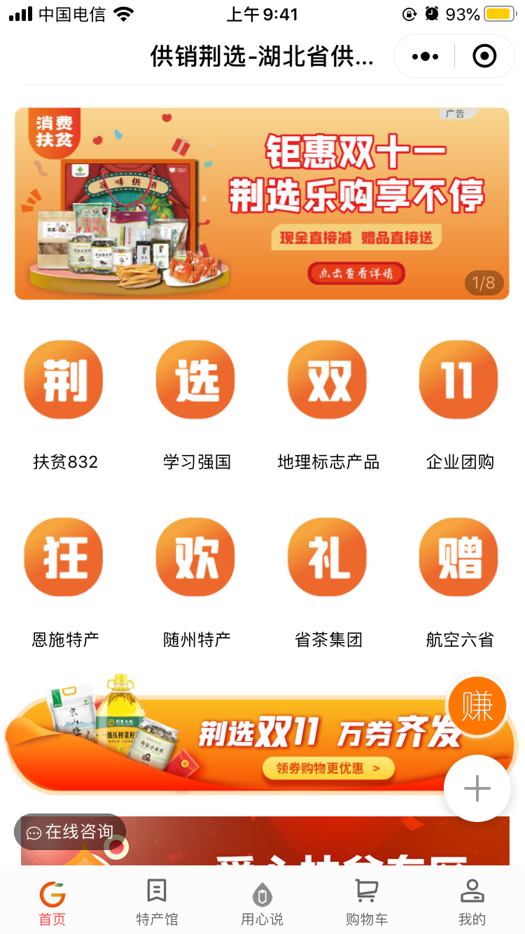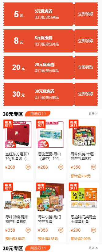 合作电商直属平台供销荆选也同步开展线上双十一消费扶贫活动,平台精选十堰武当蜜桔9.9元/5斤,随州好临门热干面23.9元/盒、麻城肉糕25元/份(下单还赠送鲜鱼面一袋),百余款湖北特色农产品供消费者们任意挑选。