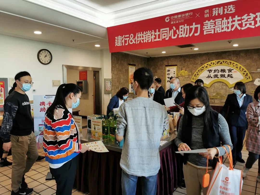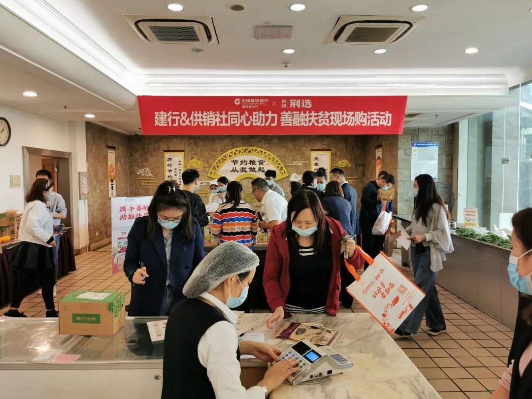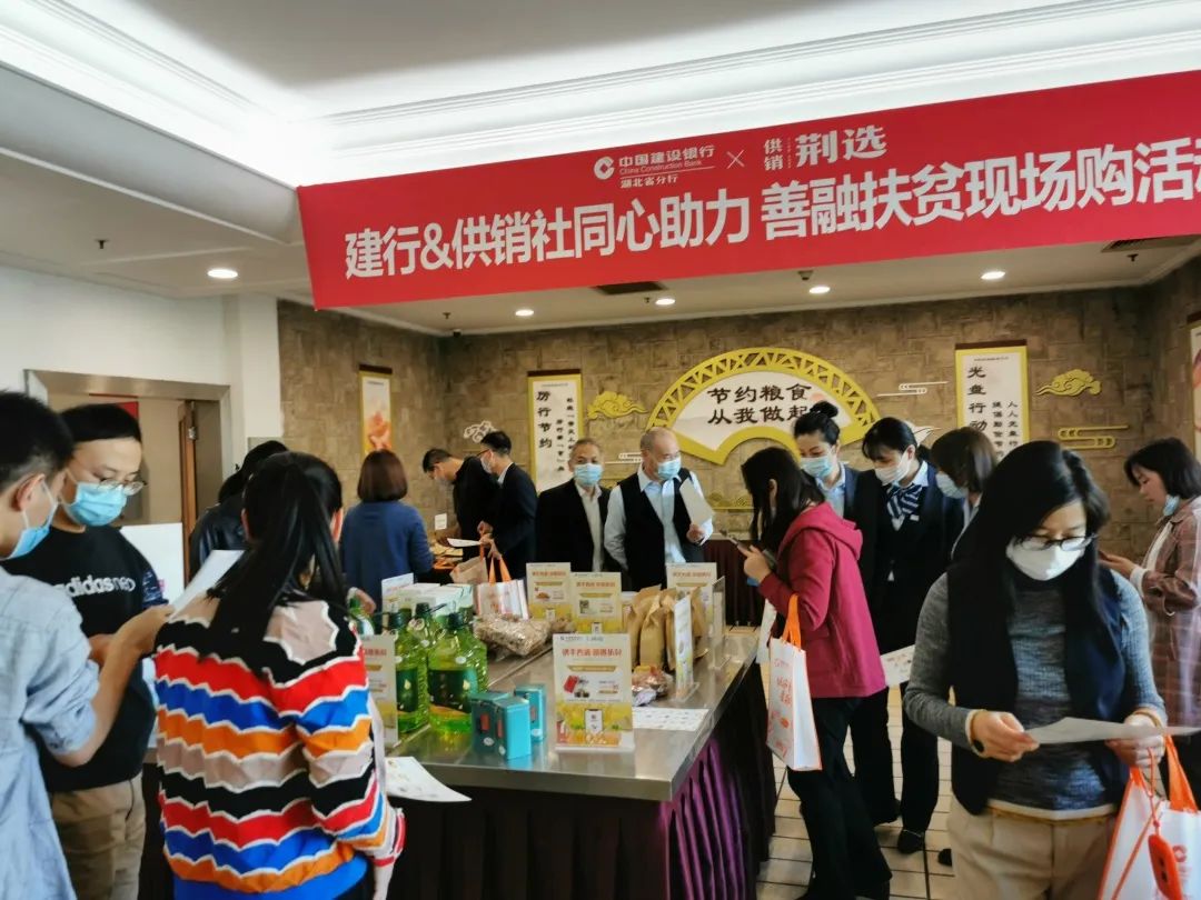 11月11日下午13:30,合作电商与建设银行湖北分行在分行大楼员工食堂成功组织开展了“携手善融,助推扶贫”为主题的扶贫现场购活动。