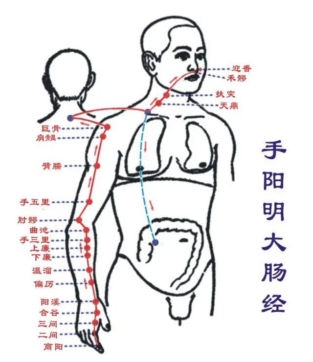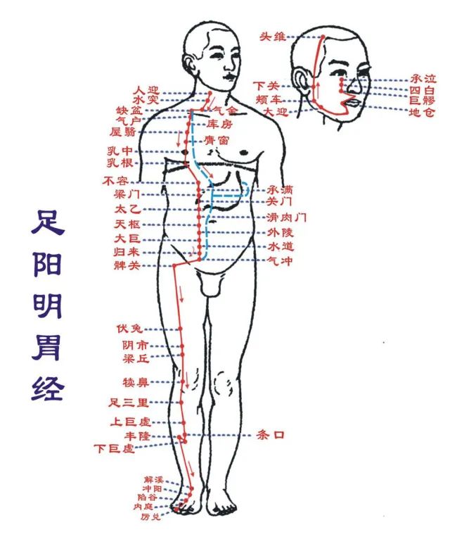 足阳明脉基本上覆盖了我们整张脸,所以如果胃的功能衰弱了,那么脸色和脸的形态就会马上出现变化。手阳明大肠经则从我们的上嘴唇这儿交叉而过,止于鼻子的两侧。